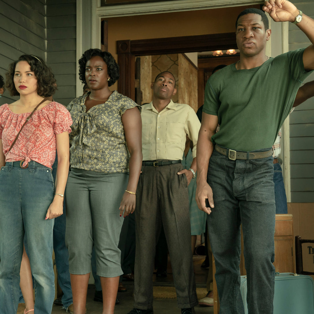 The style of the protagonist, Atticus Freeman (Jonathan Majors) is that of an off duty military man. The classic fitted t-shirt with straight leg, buckle-back denim is a timeless look that has traveled and changed styles through the years but has returned to that same fitted 50’s look in 2020.