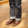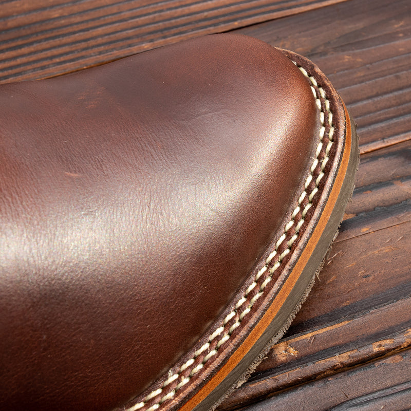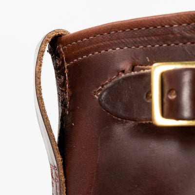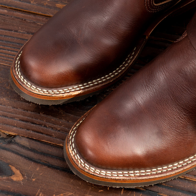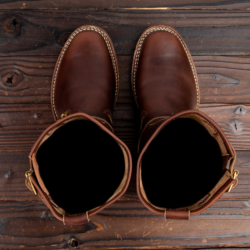 They're made from Horween brown CXL, one of our very favorite cowhide leathers. Handsome and versatile from day one, it's an extremely dynamic leather, changing significantly over time with wear, with rich tonal highs and lows, particularly in areas that move the most. The brown dye doesn't fully penetrate the hide during the finishing process, resulting in a brown boot with a light tan tea core — for a less dramatic tea core effect over time.