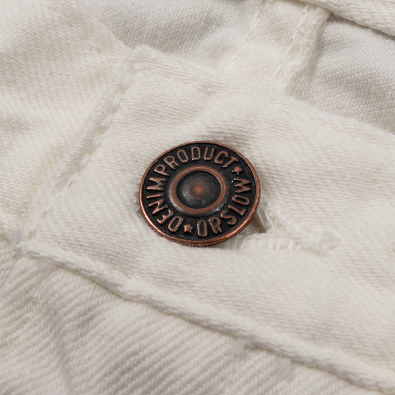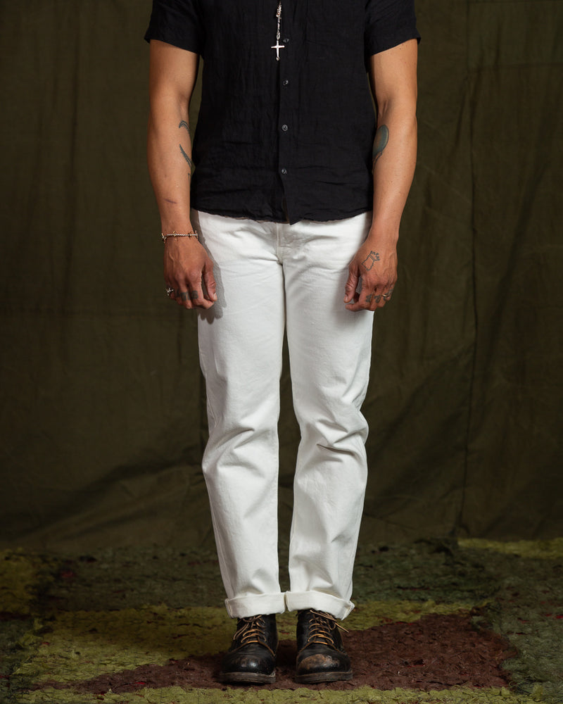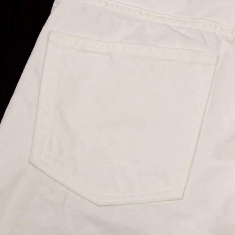 The fit is a similar to a '67 505 fit, with a short inseam for that Ivy look, right above the shoe. The white denim is custom for OrSlow, with a nice slub to it - made from 100% cotton yarns and finished with a rinse for softness, it's comfortable from day one and only gets better.