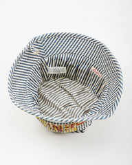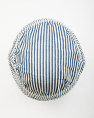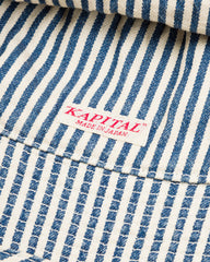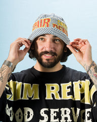 Kapital's LAUNDRY Hats are old school workwear bucket caps with vintage-style prints around the crown. This version comes in a washed hickory stripe that will continue to fade and patina with wear, and the custom "Denim Repair / Laundry" print will crack and wear away over time, developing beautifully over time.