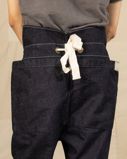Overalls, but make it an apron. These are classic Kapital taking inspiration from the apron front work overalls of the midcentury along with adding details, like the tied neck, seen on tradional aprons, all with a generous fit. Undyed cotton tape acts as the neck and waist adjusters.