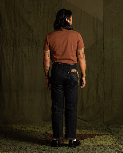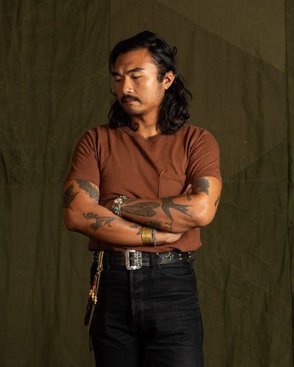 Freenote's 13oz Shifter tees are surprisingly comfortable for their weight and thickness, giving them a "tough but fair" demeanor. They're made from a custom 100% cotton knit fabric that is produced here in the USA, and then sewn together in LA. This substantial (13oz is no joke) knit uses open-ended cotton yarns, giving the fabric a very dry hand that feels cool and comfortable to wear in spite of its thickness.