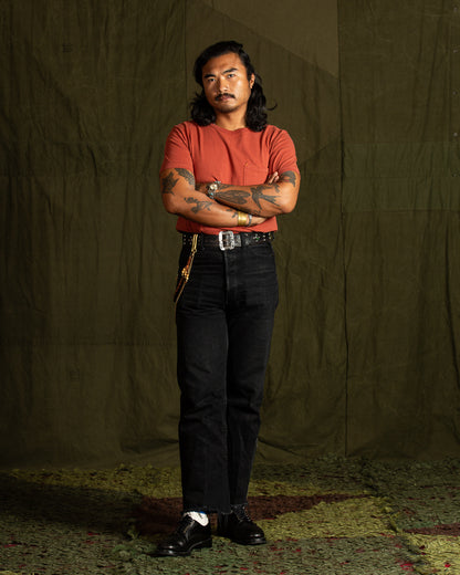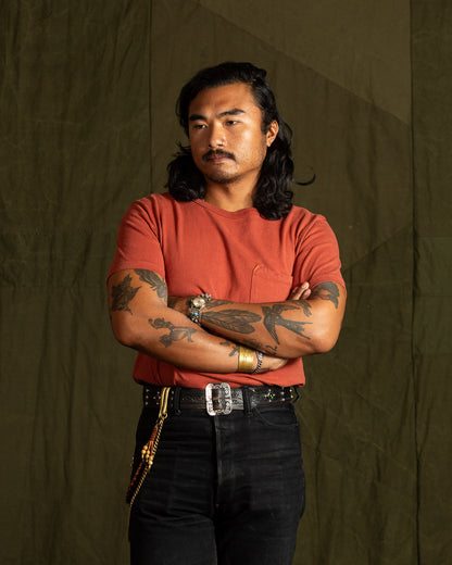 Freenote's 13oz Shifter tees are surprisingly comfortable for their weight and thickness, giving them a "tough but fair" demeanor. They're made from a custom 100% cotton knit fabric that is produced here in the USA, and then sewn together in LA. This substantial (13oz is no joke) knit uses open-ended cotton yarns, giving the fabric a very dry hand that feels cool and comfortable to wear in spite of its thickness.