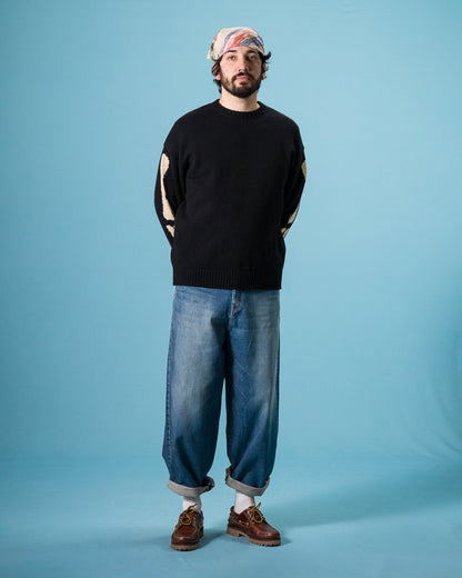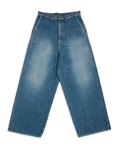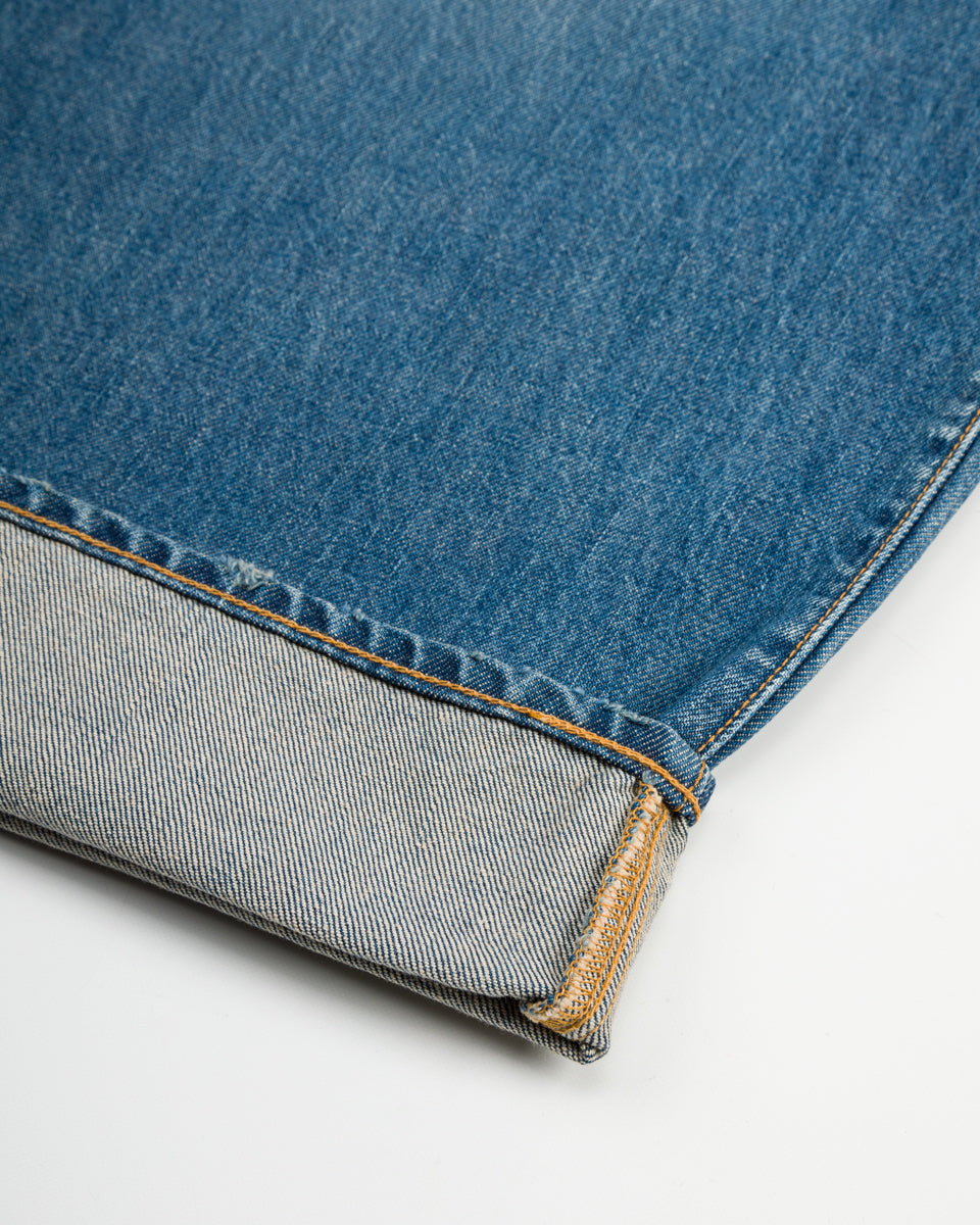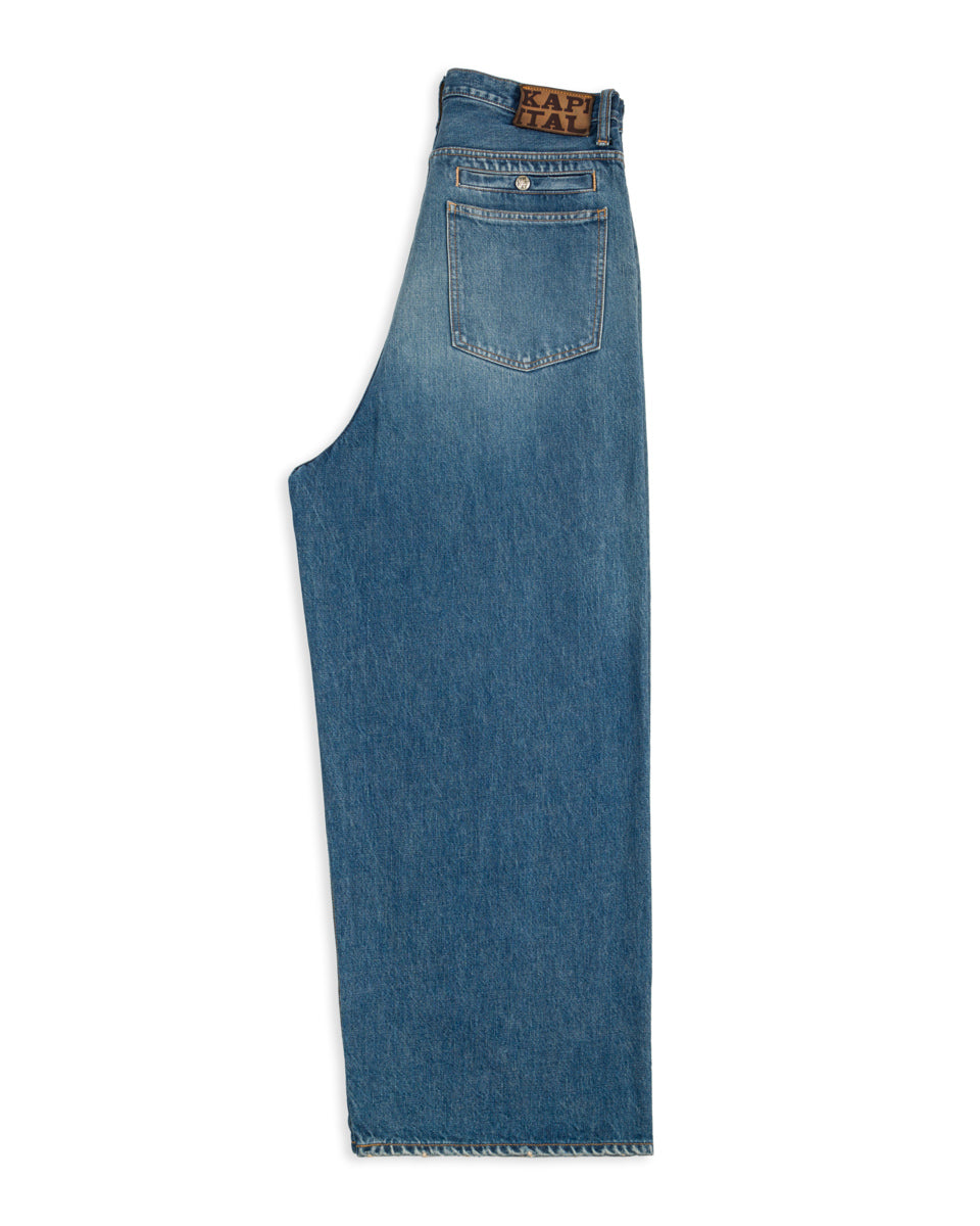 The fabric is Kapital's 14oz indigo denim, woven from 100% cotton yarns and given a custom wash to soften the and preemptively fade the indigo, resulting in an immediately comfortable and perfectly "worn" look and feeling out the gate. Over time, they'll continue to fade and wear in, developing more high contrast areas throughout.