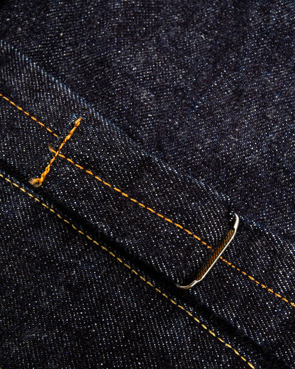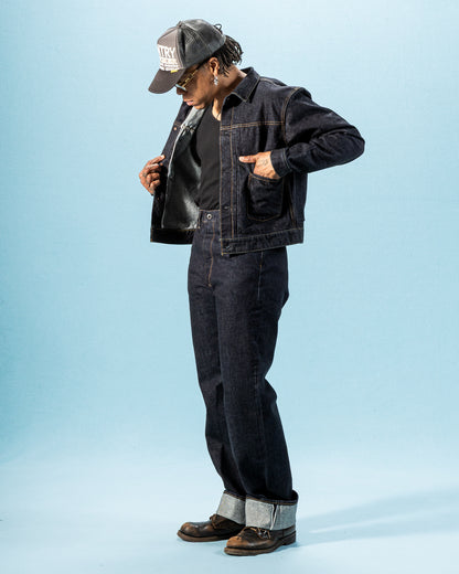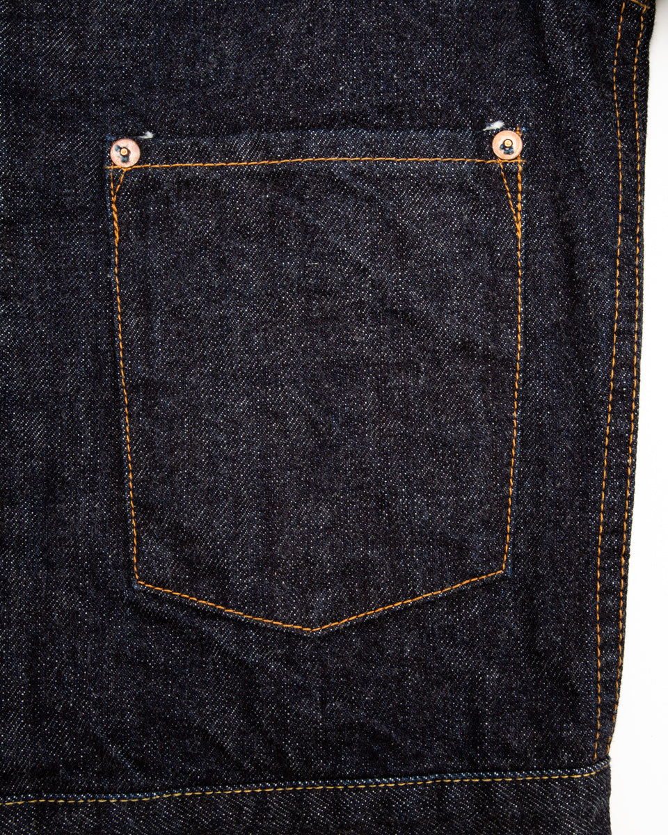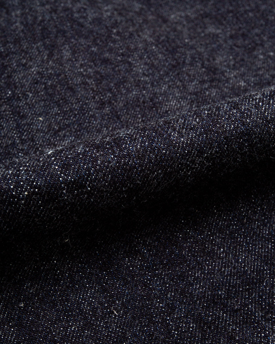 The fabric is a 14oz indigo selvedge denim from Japan. This 100% cotton fabric has been rinsed once to account for initial shrinkage and to help remove excess indigo dye. Like other indigo denims, this jacket will fade uniquely with wear and washing over time.