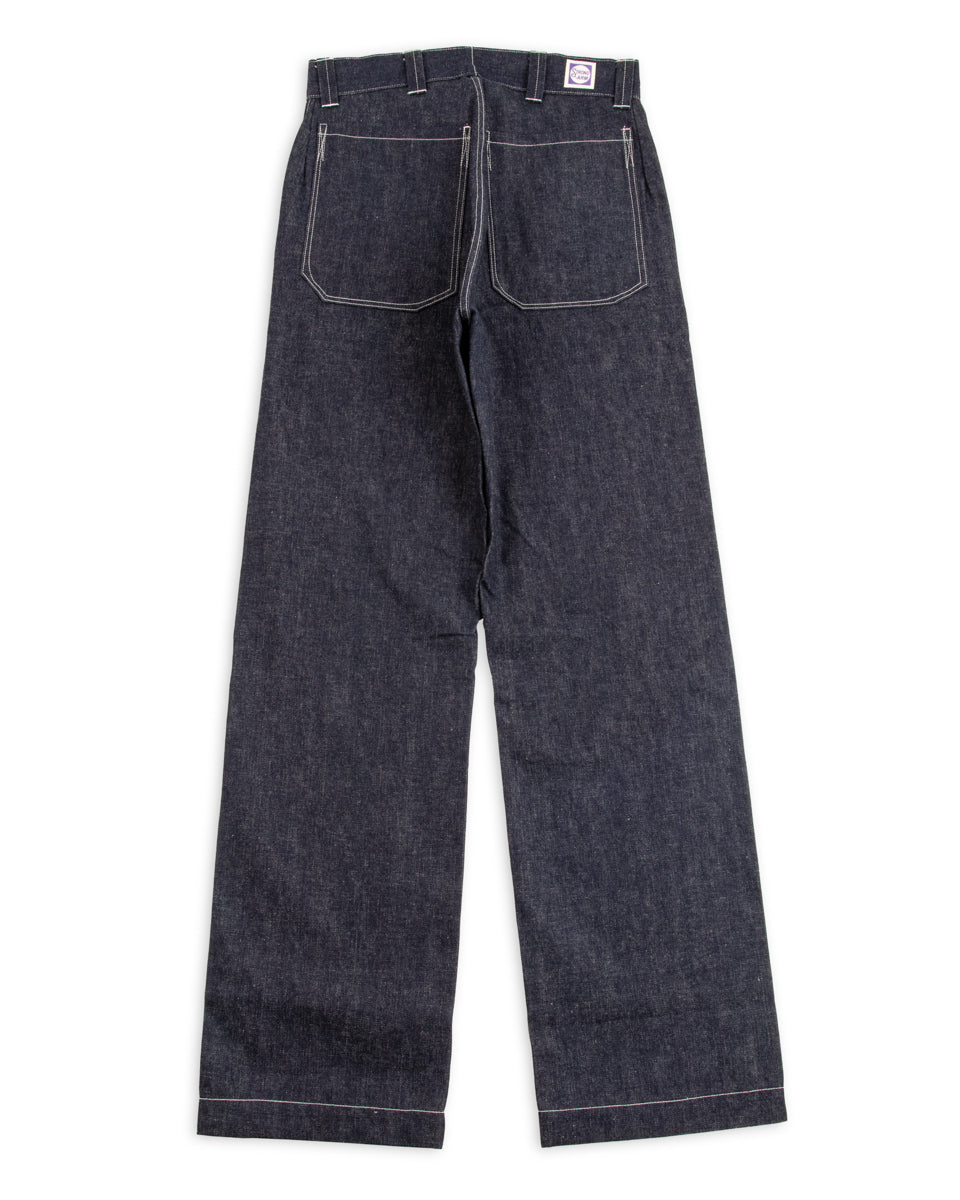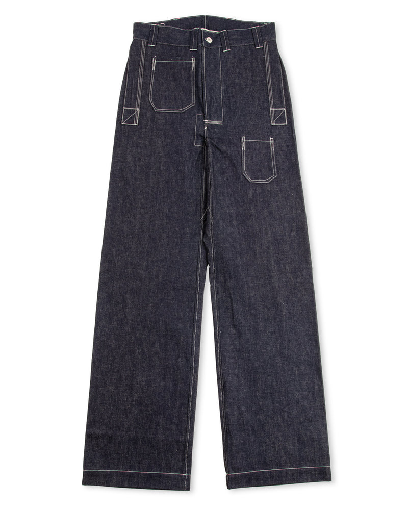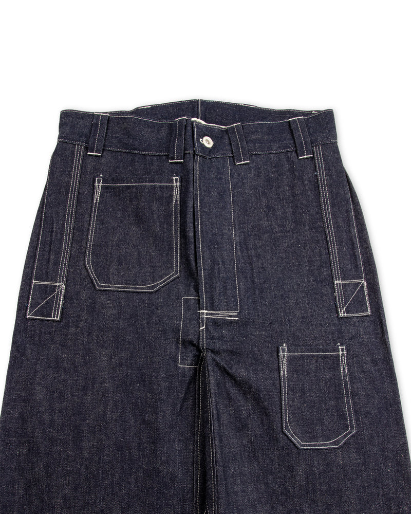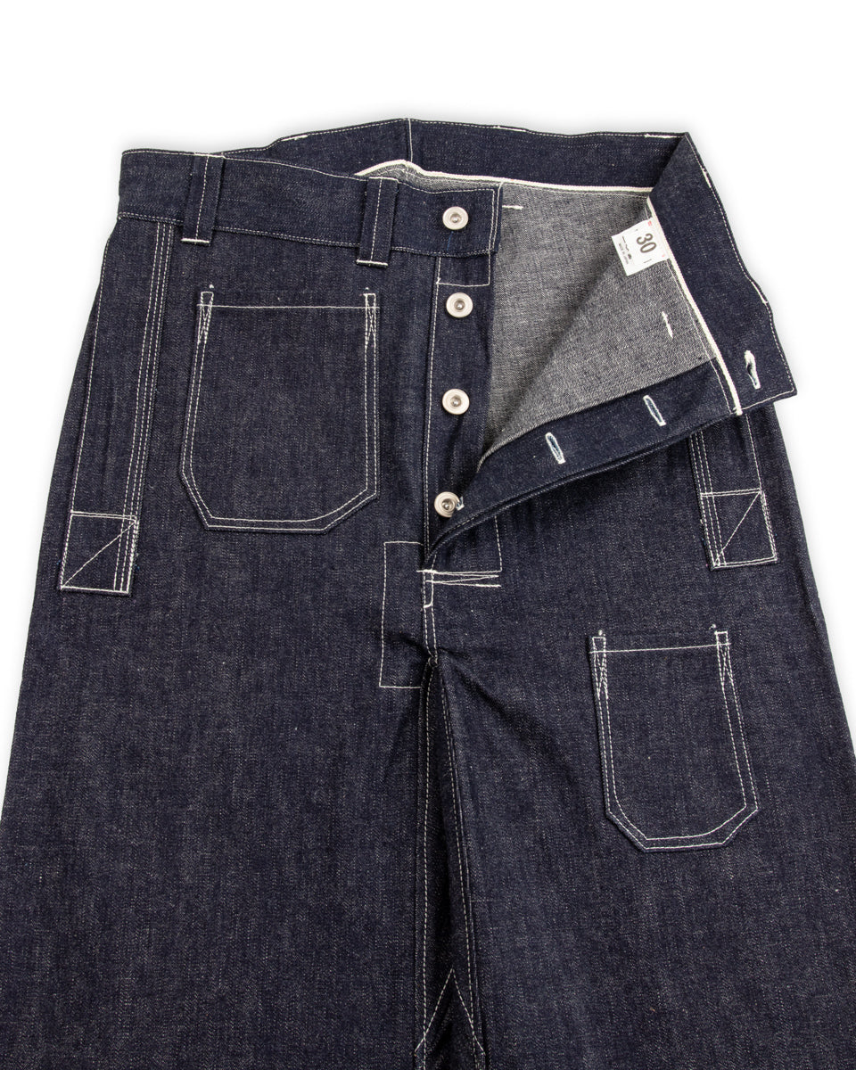 The 1910s Netmaker's Trousers are some of the best denim we've gotten our hands on. These have an extremely unique construction, with tailoring details that lead John Gluckow and associates to believe that the original designer of these probably mainly produced tents and non-apparel items. In addition to the charming asymmetrical front pockets and reinforced hand pockets, they feature wrapped legs that don't have any outseam.
