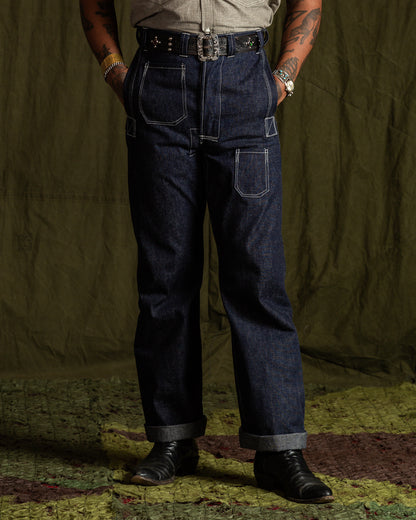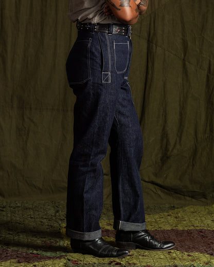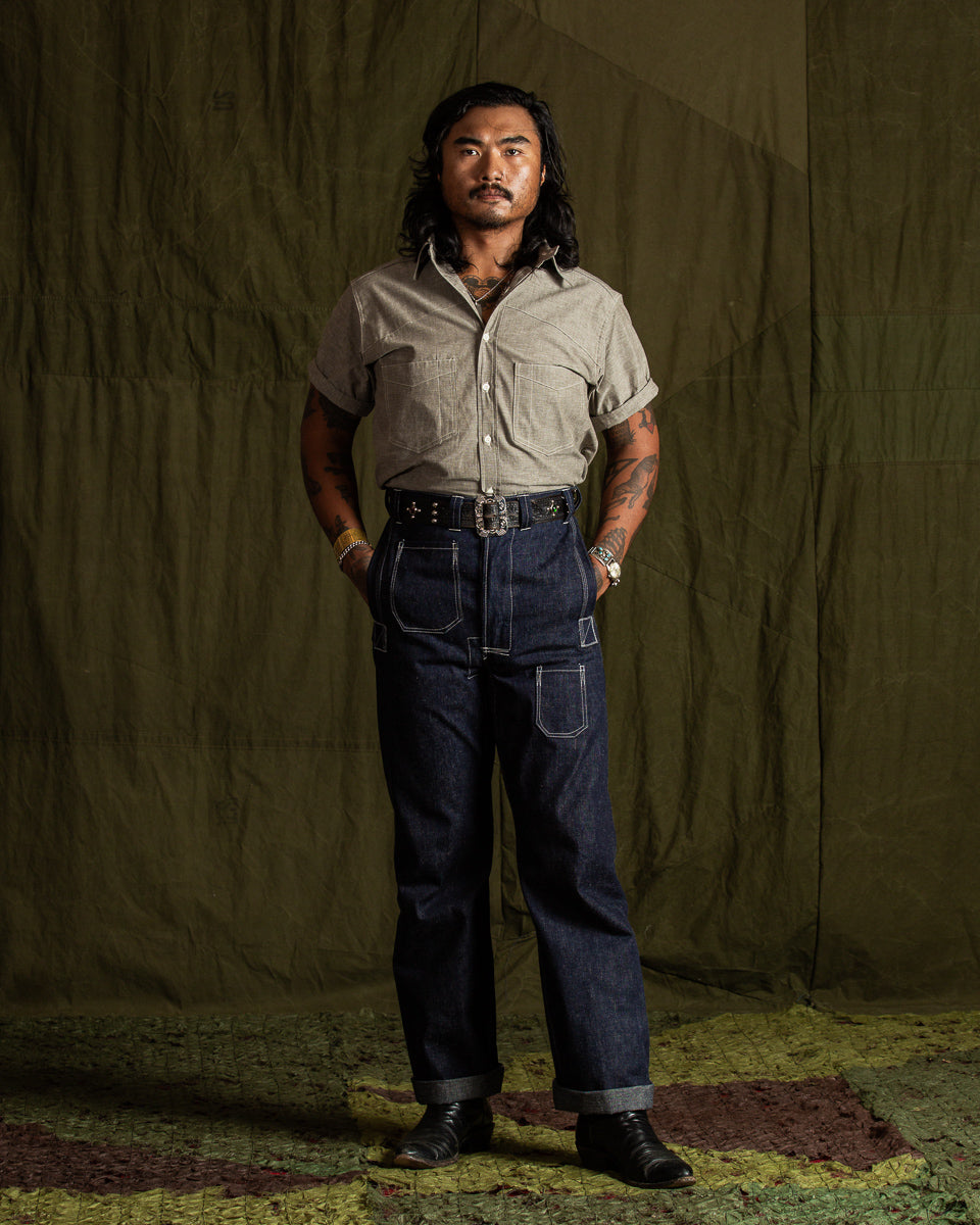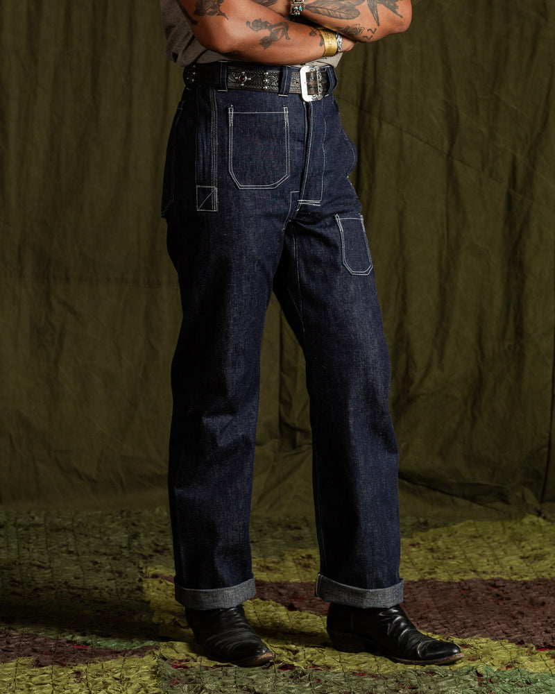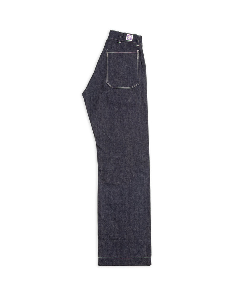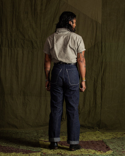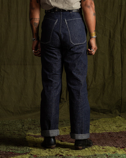 The 1910s Netmaker's Trousers are some of the best denim we've gotten our hands on. These have an extremely unique construction, with tailoring details that lead John Gluckow and associates to believe that the original designer of these probably mainly produced tents and non-apparel items. In addition to the charming asymmetrical front pockets and reinforced hand pockets, they feature wrapped legs that don't have any outseam.