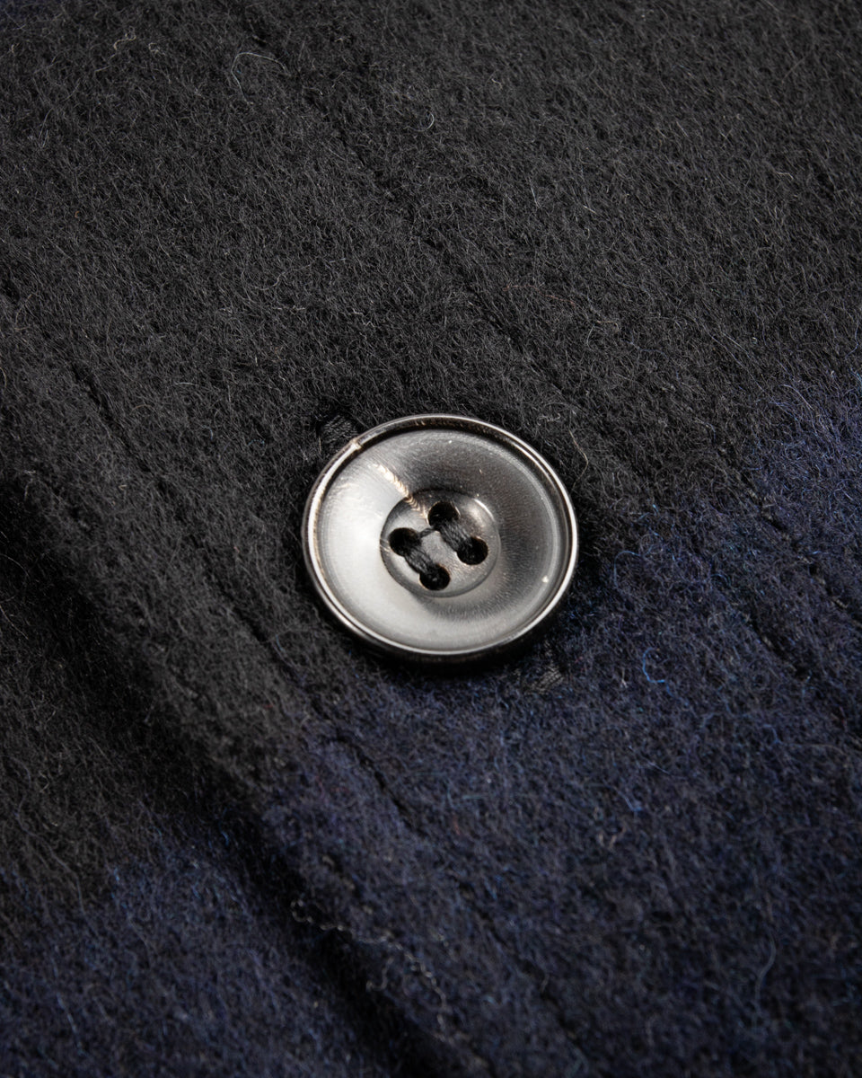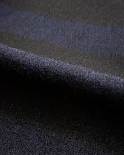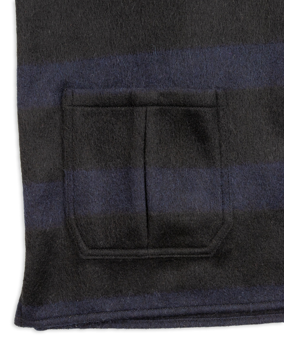 It's made from a thick wool-blend fabric that mixes recycled wool/nylon yarns for the warp and wool/angora yarns for the weft, with 100% cotton trims on the inside for extra durability. Woven in Japan's Bishu region, an area with a long history and specialization in wool products, it's thoroughly brushed for a maximally soft hand and slightly hairy texture across its face.