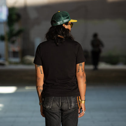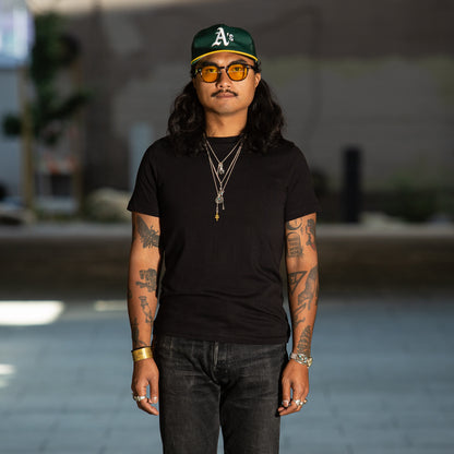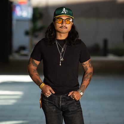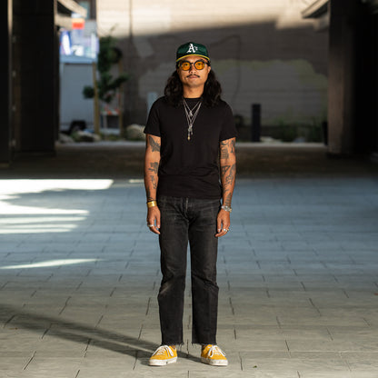 It's got a classic, old school tee fit with tight shoulders, extra short sleeves, and an ever so slightly fitted chest. Triangle underarm inserts allow a full range of movement even with the 1/4 length sleeves and more narrow shoulders. The torso is cut slightly longer than other vintage tees (even after shrinkage), great for tucking in, but not so long as to look unnatural untucked.