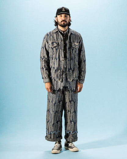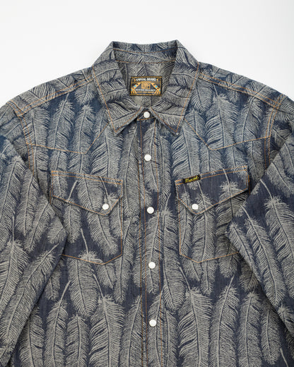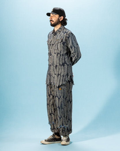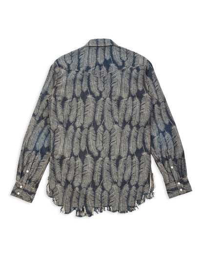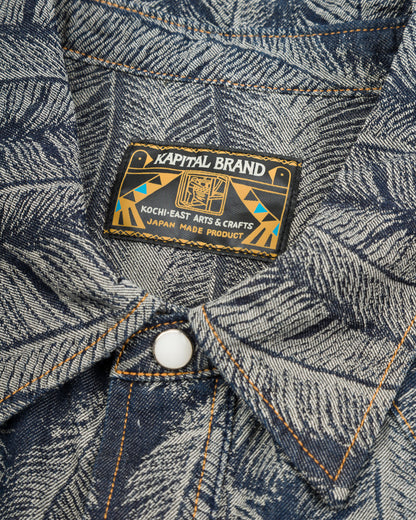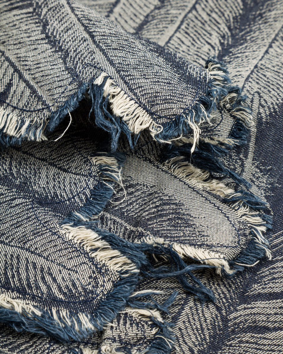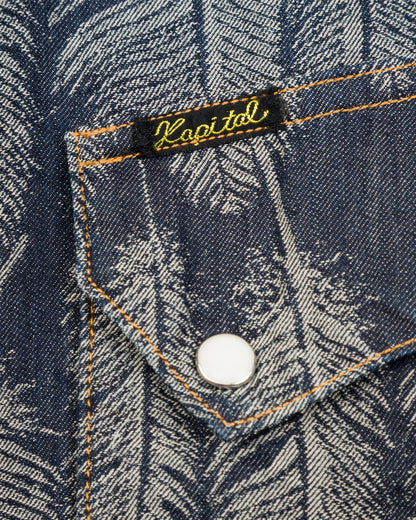 The fabric is a 100% cotton, indigo-dyed jacquard denim that will fade over time with wear and washing. Clocking in at just 5oz, it's a a comfortable shirt fabric, and feels noticeably lighter than the jacket version of this fabric. Kapital have "pattern matched" the bottom of this shirt, cutting the hem of each garment along the pattern, allowing the hem to follow the shape of the feathers.