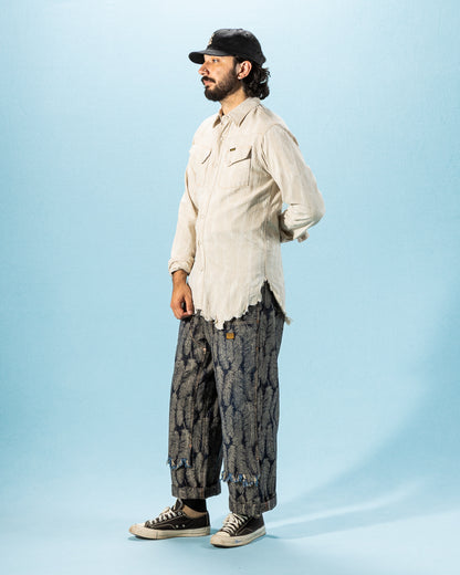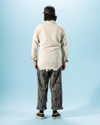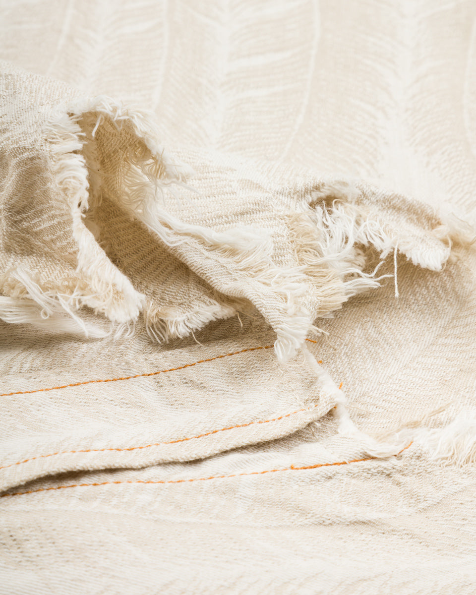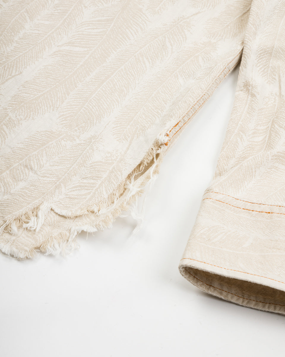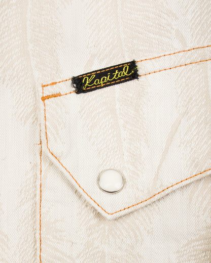 The fabric is a 100% cotton ecru jacquard denim that will take in color and slightly darken over time from wear. Clocking in at just 5oz, it's a a comfortable shirt fabric, and feels noticeably lighter than the jacket version of this fabric. Kapital have "pattern matched" the bottom of this shirt, cutting the hem of each garment along the pattern, allowing the hem to follow the shape of the feathers.