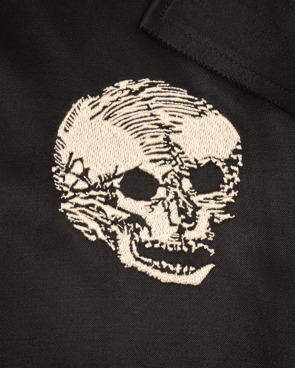 The jacket is made from a rayon cotton blend, giving in an almost theatrical sheen. A simple A-line Silhouette with a wide open collar and half-belted back gives the whole jacket a distinctive and distinguished look. It's finished with skull embroidery on the chest and back, and features a button front with two side patch pockets along the hem.