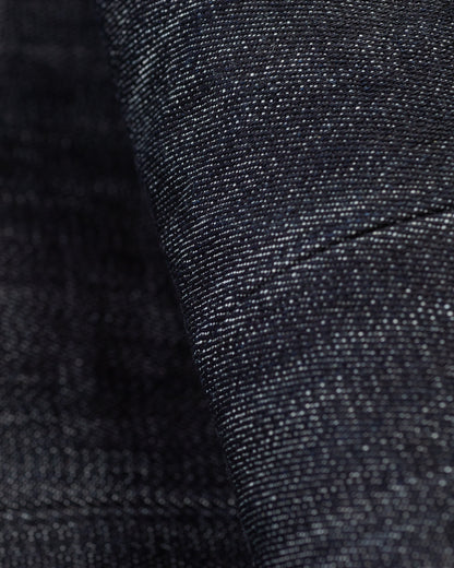 It's made from "Super Slub" denim, an aptly named cotton fabric with a rich indigo dye and a seriously intense slub texture throughout. Over time, as the indigo is worn and washed out, this low tension fabric will develop unique high contrast fades throughout.