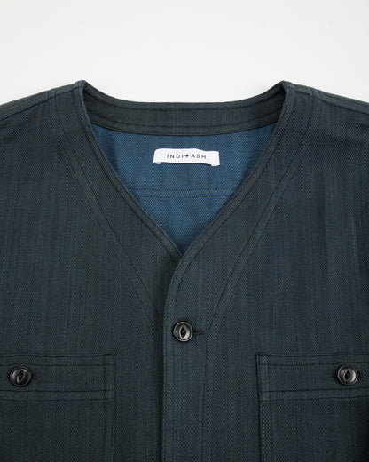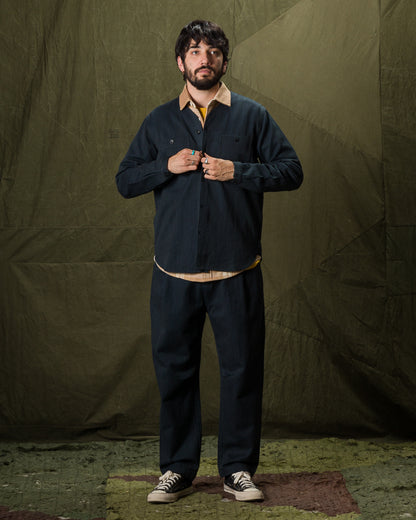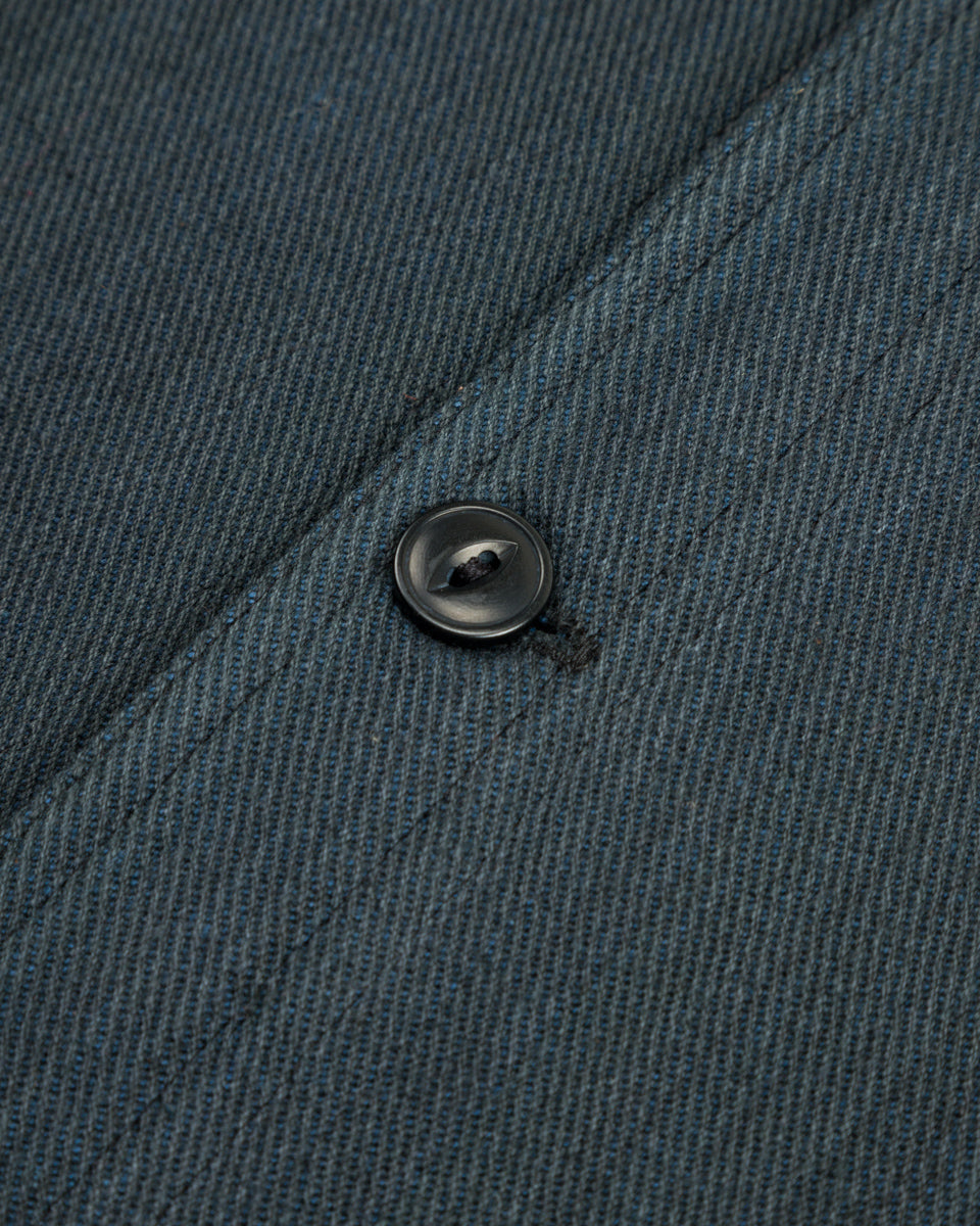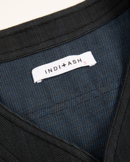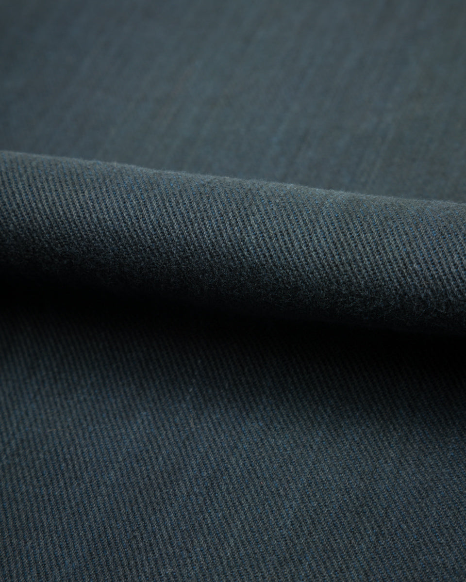 It's made from Indi + Ash's handwoven denim, a 100% cotton 2x1 twill with a slightly irregular face texture. The handwoven nature of the fabric highlights its slubby yarns, the warp of which is colored with iron-based dyes, while the weft uses natural indigo. Despite its relative heft and sturdiness, the fabric is immediately soft and comfortable, requiring no break in. Over time, the fabric will continue to soften and relax, while the indigo and irons yarns will also gradually fade, especially after washing, developing a unique patina for each wearer.