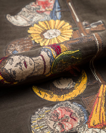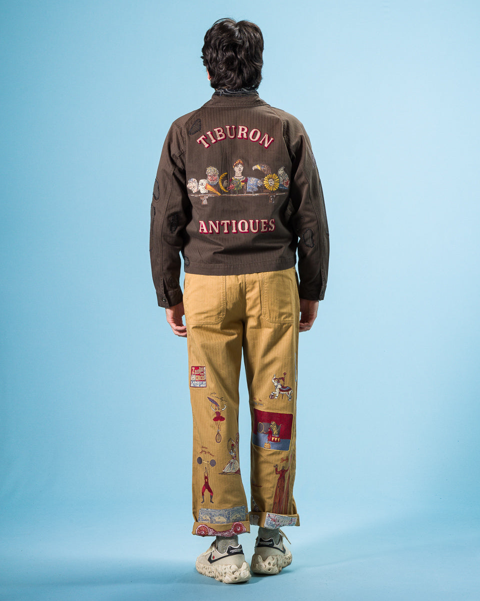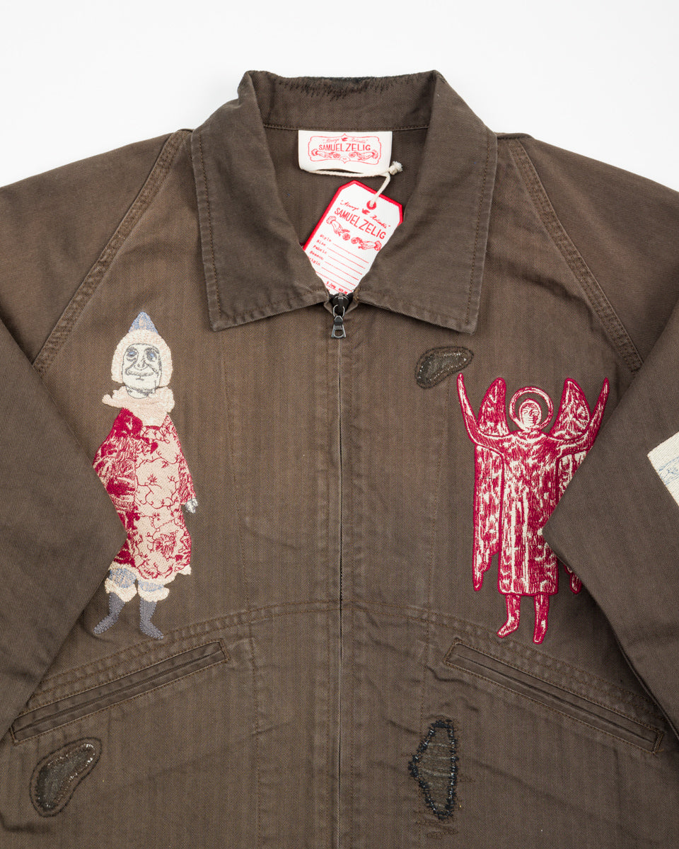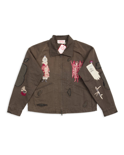 The Antique Zip Jacket is a lightweight work jacket with a weathered finish and an almost-cropped silhouette, as well as prominent embroidered designs and repaired details. Cut with an easy zip placket, it features a classic collar and two hand pockets, with raglan sleeves for ease of movement and button cuffs at the end of the sleeves. It's got an old-school fit that runs on the smaller side, making this an ideal unisex piece — but if you're between sizes, you'll want to take the larger of the two.