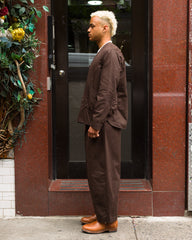 Hanson's Bernard is lightweight, unlined collarless jacket with a wide fit. It has two front bellows pockets on separate panels that wrap around the side of the jacket creating a distinctive look.