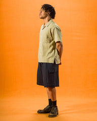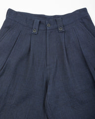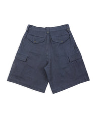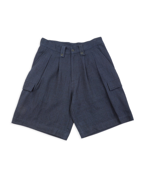 The Big Short is the name of both a movie and these trousers, which are an exaggerated cargo short with big legs and plenty of pockets. They're made from Indi + Ash's powerloom (so not handwoven) cotton herringbone, with a dark navy finish thanks to its iron-dyed warp and natural indigo dyed weft yarns. Over time, both dyes will fade from wear and washing, resulting in a unique and handsome patina across the fabric's surface. It's surprisingly soft from day one, despite it's respectable medium weight, and drapes excellently for a summer fabric.