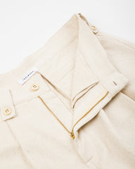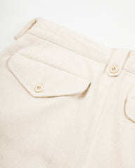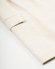 The Big Short is the name of both a movie and these trousers, which are an exaggerated cargo short with big legs and plenty of pockets. They're made from Indi + Ash's powerloom (so not handwoven) cotton herringbone, with an undyed natural cotton yarns. Over time, the undyed fabric will take in pigments from the world around you, resulting in a unique and handsome patina across the fabric's surface. It's surprisingly soft from day one, despite its respectable medium weight, and drapes excellently for a summer fabric.