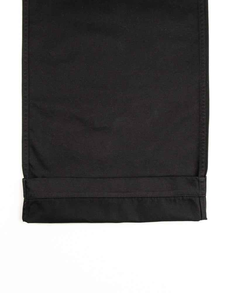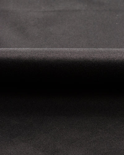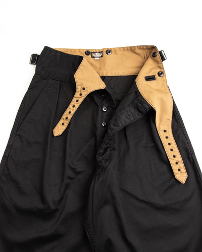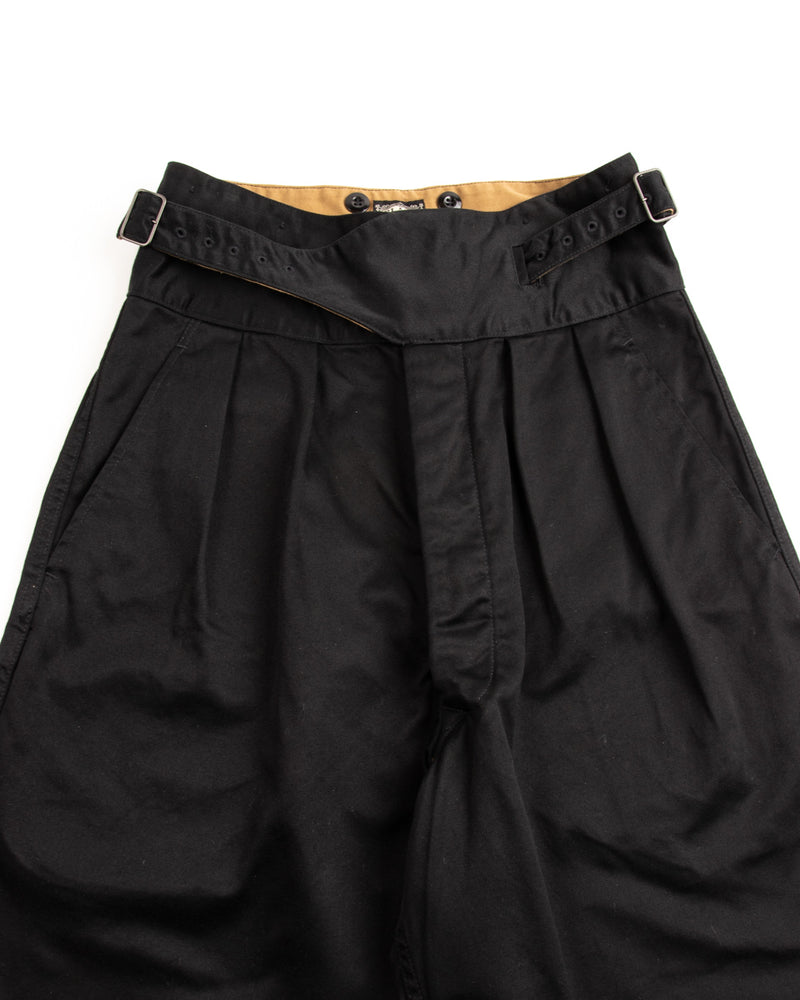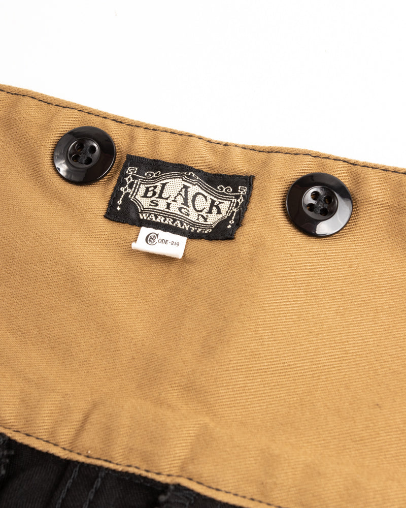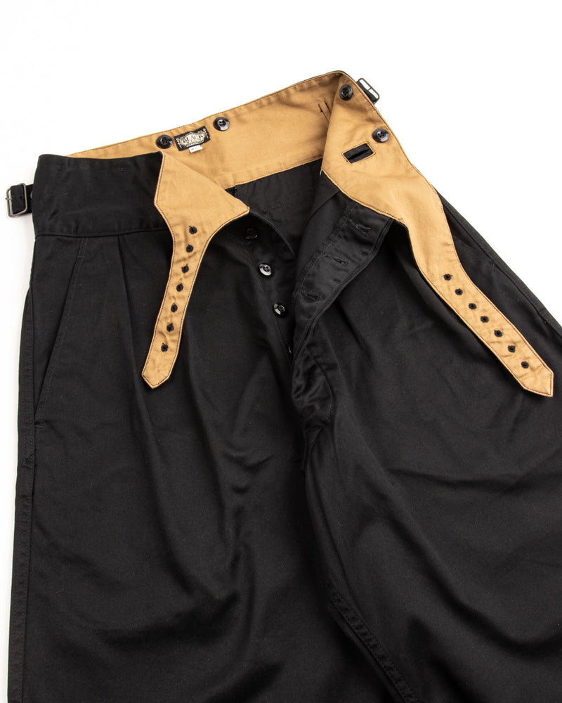 Made from a medium-lightweight military moleskin fabric, these are a comfortable 100% cotton material, suitable for wear almost all year long. Sturdy without being stiff, it's the black fabric develops beautifully over time, softening and developing a gentle luster in certain areas. The pocket bags are cut from an olive drab military HBT, and the front closes up with a metal button fly and two crisscrossed belts.