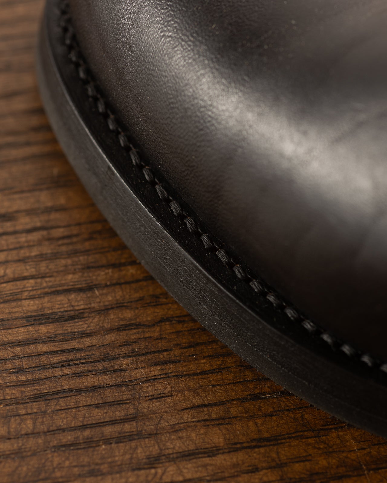 They're made from a black, tea-core horsebutt leather, with a semi-gloss finish and a thickness of between 2.3mm and 2.5mm - dense, but not overly stiff, these will break in to the shape of your foot with wear. This vegetable tanned leather is sturdy, with natural scars and blemishes across its surface, and the subtle grain texture of a high quality horsebutt. Over time, the black dye will scuff and wear down, revealing the natural brown core beneath, developing a classic and highly sought-out vintage patina.