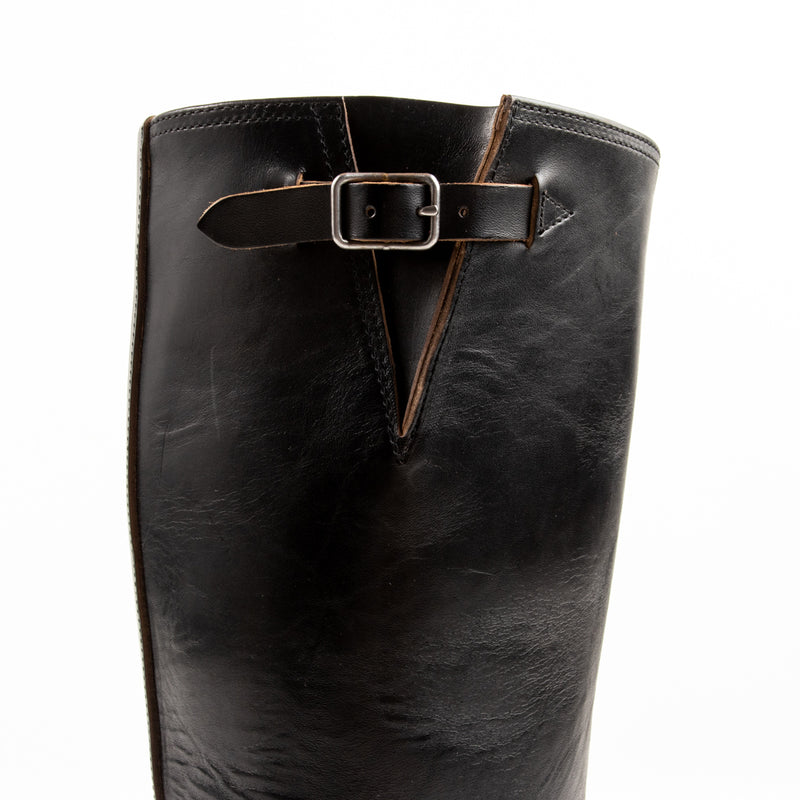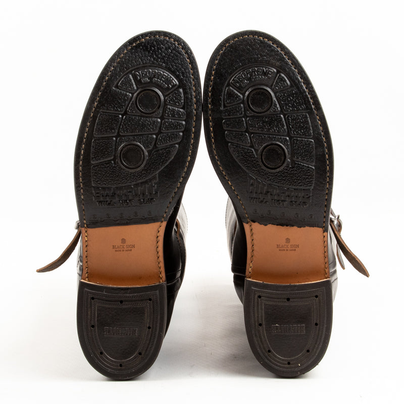 The Black Sign Aviator Boots are hands down some of the most handsome Engineers we've ever carried. Standing at a remarkable 14.5" height, these are less "biker" and more "pilot" or "equestrian" with a lowered block heel (as opposed to the usual logger heel), extended shaft, and sleek 270 degree flat welt. Unlike other more modern boots, these lack a traditional heel counter, being finished with an internal seam where the vamp meets the rear half of the boot - imbuing a sleeker and more antique aesthetic throughout, but increasing the time and effort it takes to produce each pair.