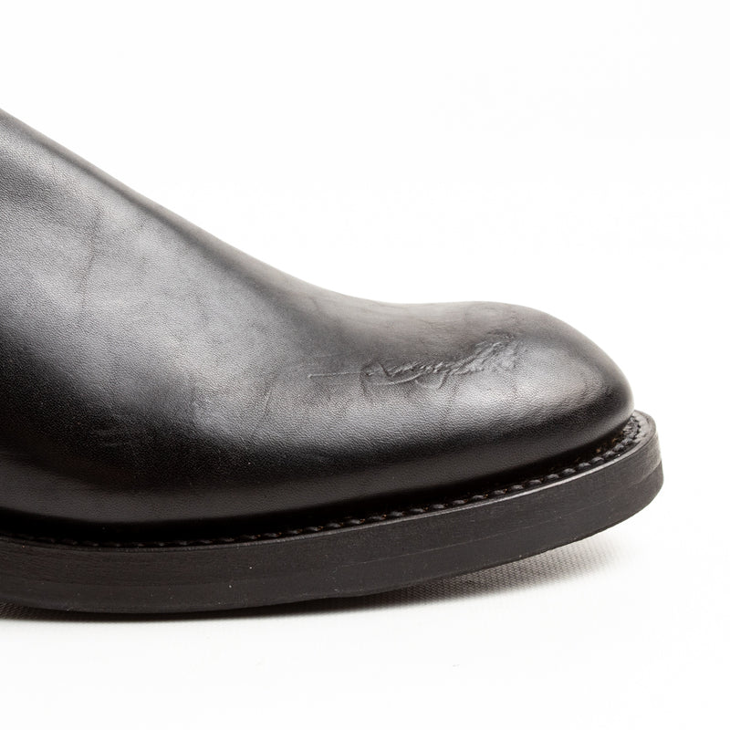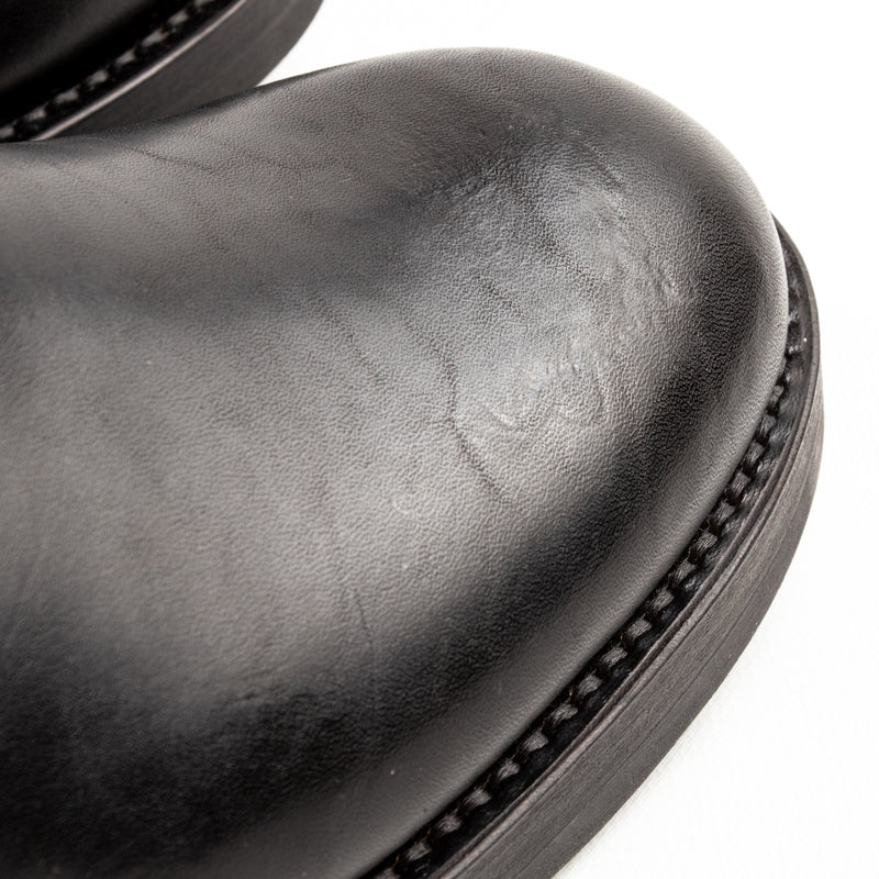 They're made from a black, tea-core horsebutt leather, with a semi-gloss finish and a thickness of between 2.3mm and 2.5mm - dense, but not overly stiff, these will break in to the shape of your foot with wear. This vegetable tanned leather is sturdy, with natural scars and blemishes across its surface, and the subtle grain texture of a high quality horsebutt. Over time, the black dye will scuff and wear down, revealing the natural brown core beneath, developing a classic and highly sought-out vintage patina.