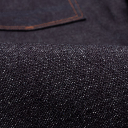 The No. 9 denim by Indigofera is made exclusively for them by Nihon Menpu. The idea behind this denim is to have a denim that is so tightly woven that no white will show through from the weft. This tight weave combined with a dark rope dye on the warp yarns create a very dark denim that will fade slowly.