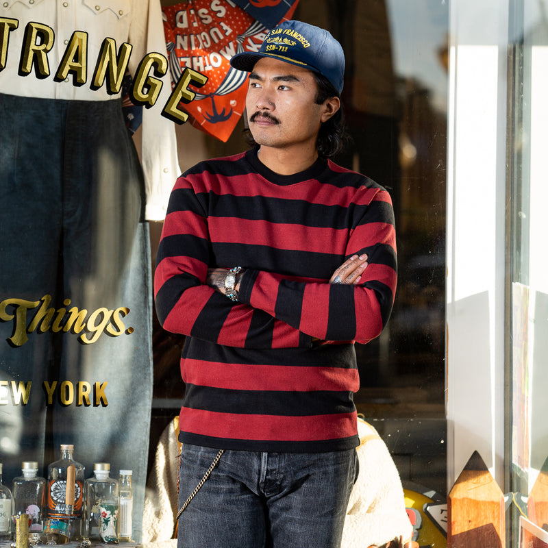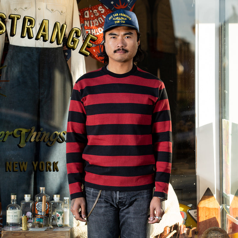The Buco Heavy Stripe Jerseys are just that, heavy. These are a tight, 100% cotton knit, made using narrow yarns and with all the structure of a longsleeve tee - but the weight and thickness of a winter sweater. An unbrushed knit, these feel the same on the inside as they do on the outside, and are perfect layering garments for cool weather and transitional seasons.