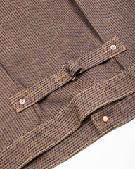 The weaving process to create this denim is a trade secret with Kapital - it all goes through one loom and one loom only. The No. 5S Century Denim fuses classic American denim manufacturing with Japanese kakishibu dyeing – a process using fermented persimmon juice that yields an almost terracotta color – and then, just for good measure, adds on sashiko stitch weaving throughout the fabric.