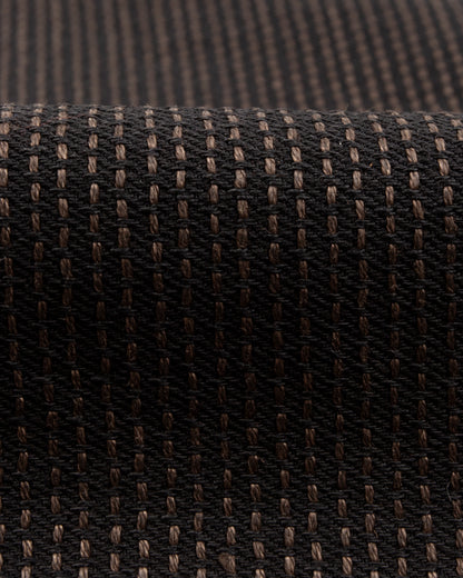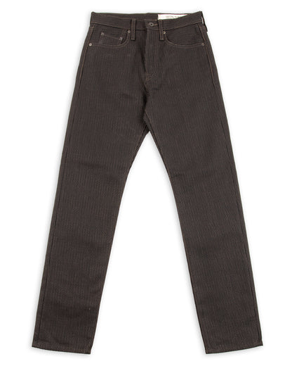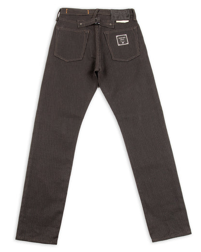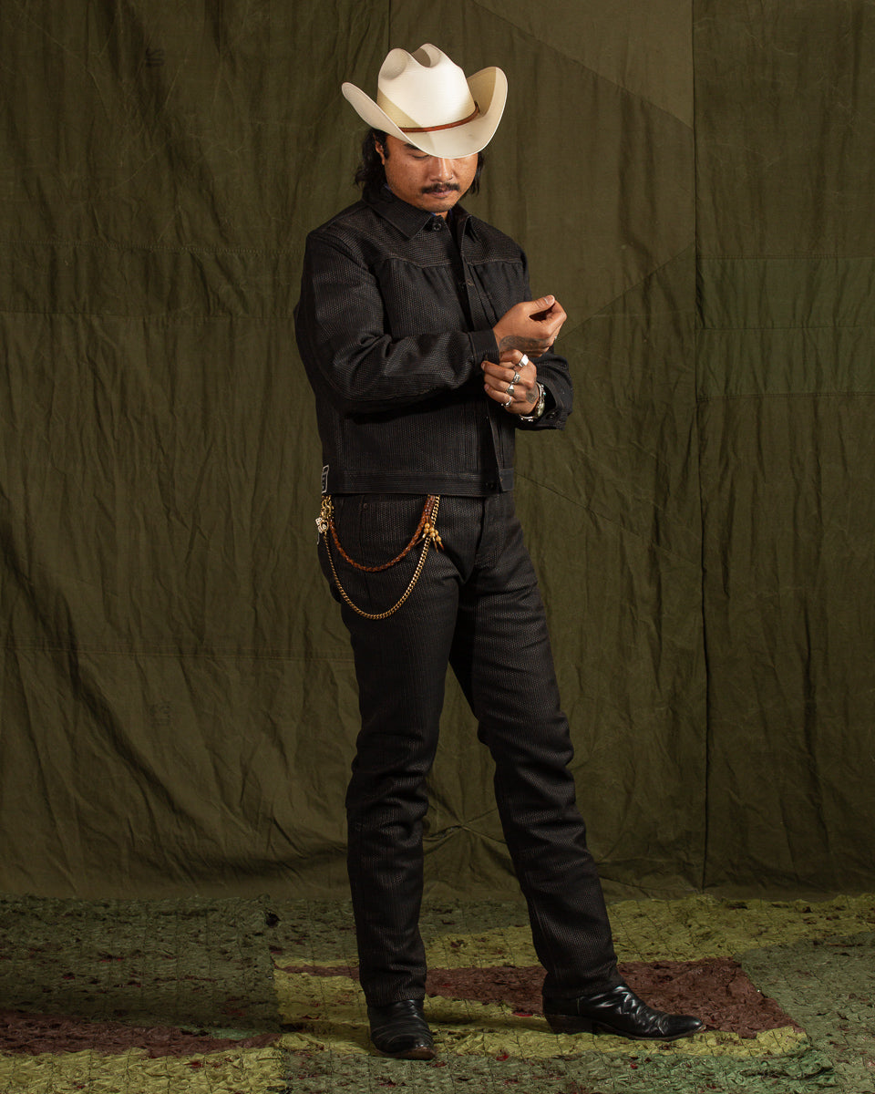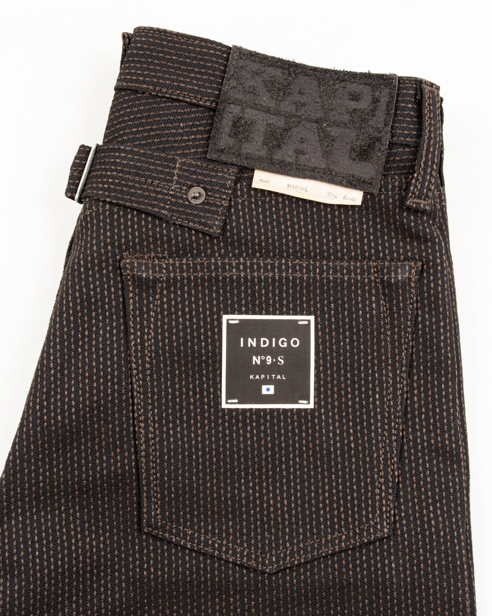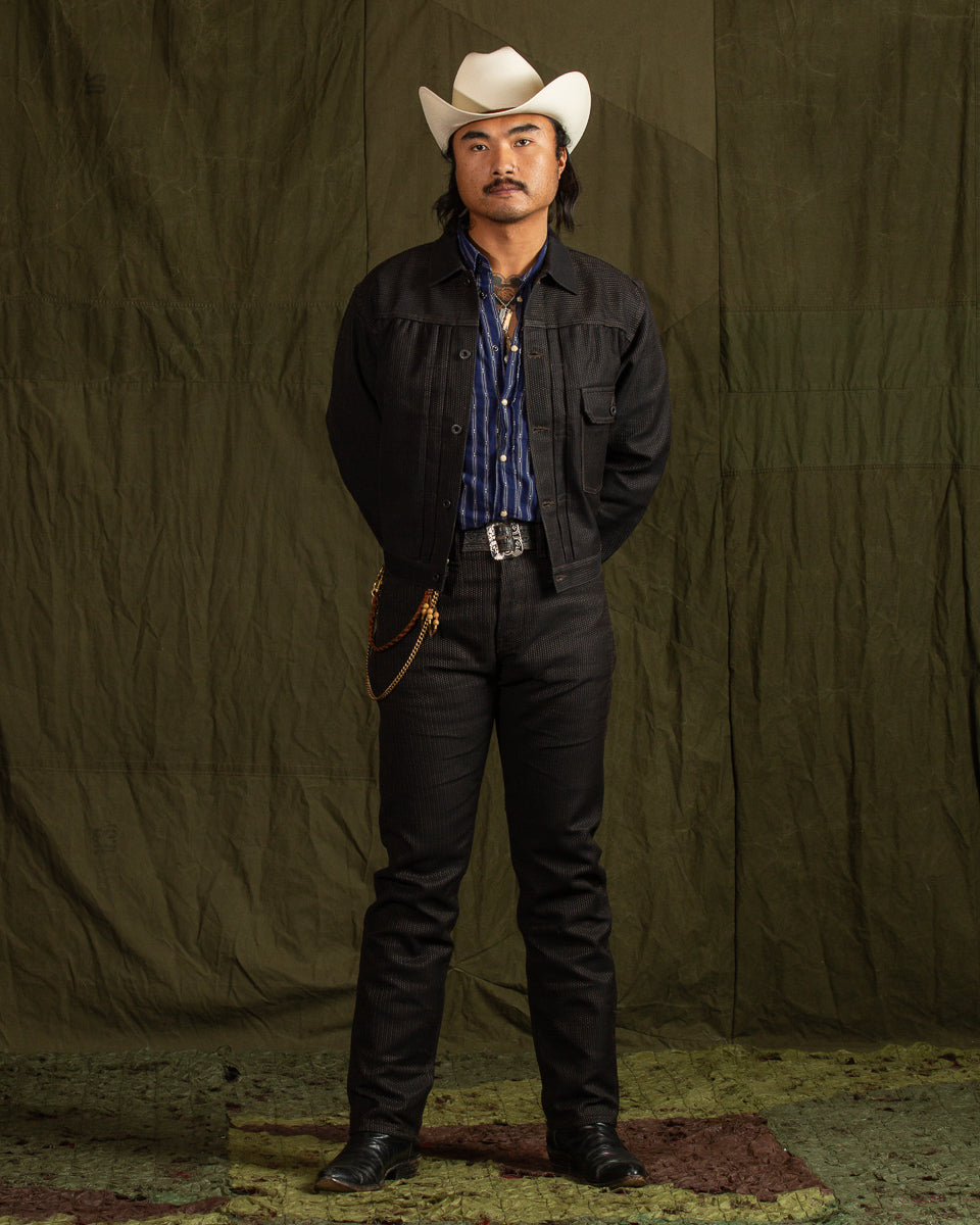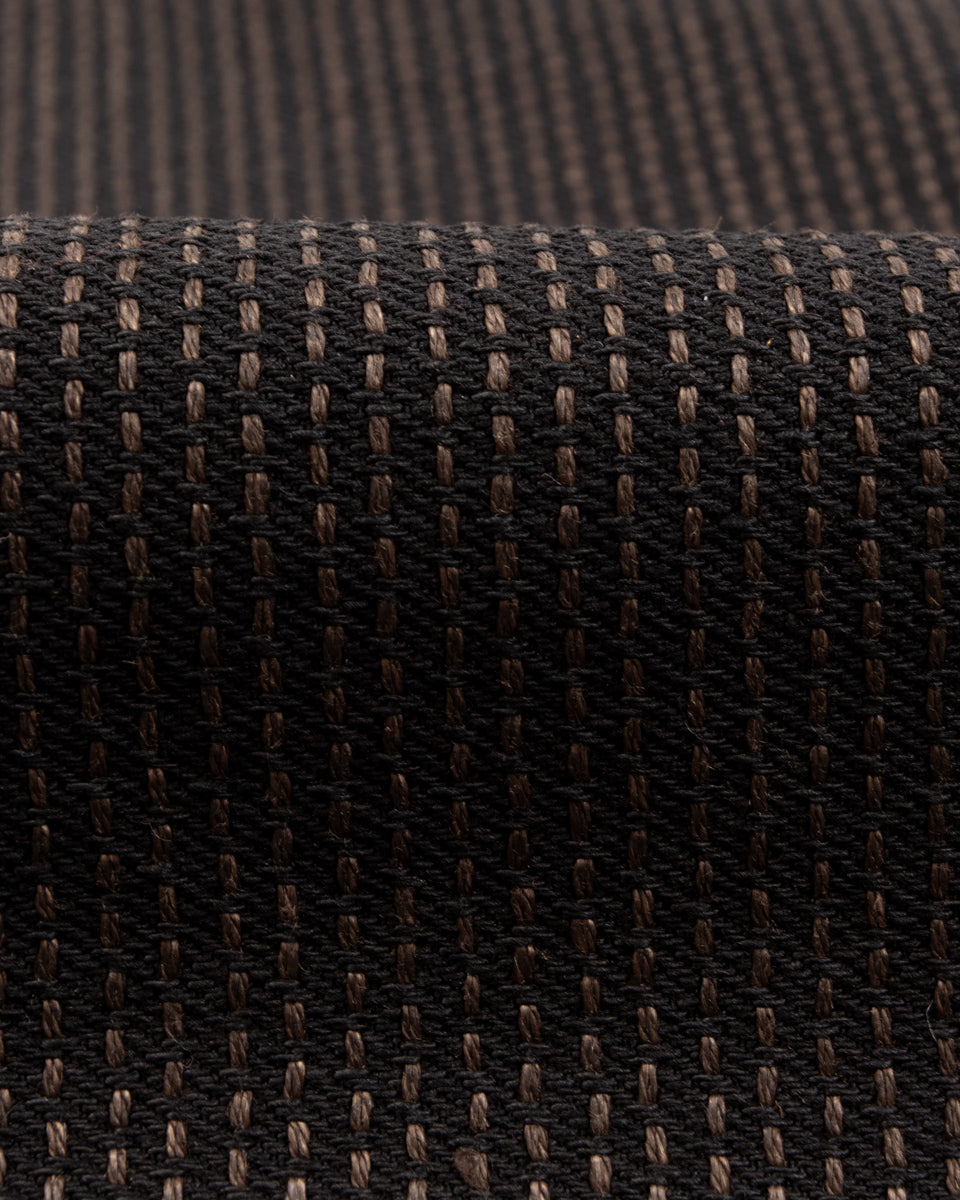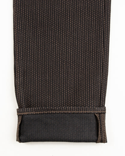 The No. 9S Century Denim is an almost black on almost black sulfur dyed denim with deep brown mud-dyed topstitching. The mud dye is of particular interest here, as the technique used on these is only practiced in Amami Oshina by expert artisans, and nowhere else in the world. Yarns are first hank dyed in a natural Yeddo Hawthorne bark tannins and lime (the chemical not the fruit), dyeing them brown, before being taken and immersed in a local mud pit and then rinsed in a nearby stream, imparting color from mud-based iron and charcoal into the fabric.