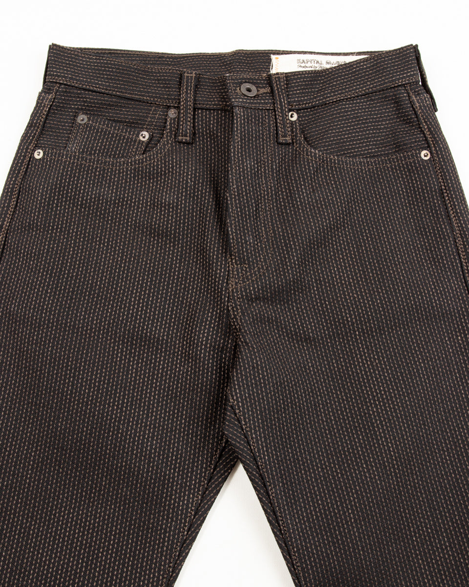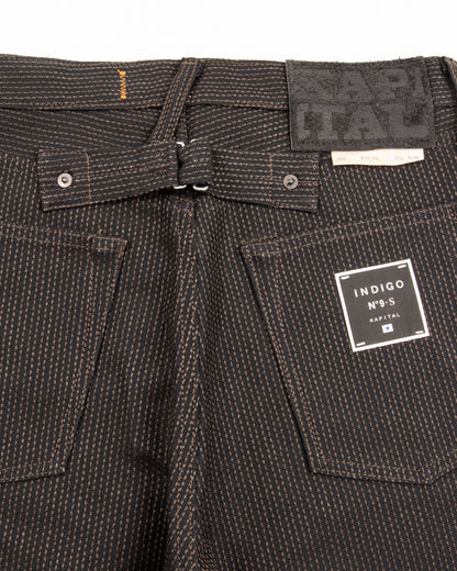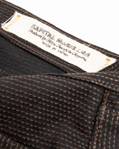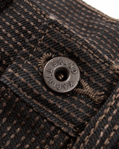 Kapital's Century Denim is one of their signature fabrics- a completely proprietary Sashiko topstitched denim available in a variety of unique patterns and dye combinations. Sashiko (literally "little stabs") is a form of stitching that was initially utilized functionally to repair or reinforce damaged fabric, eventually growing popular for decorative purposes as well.