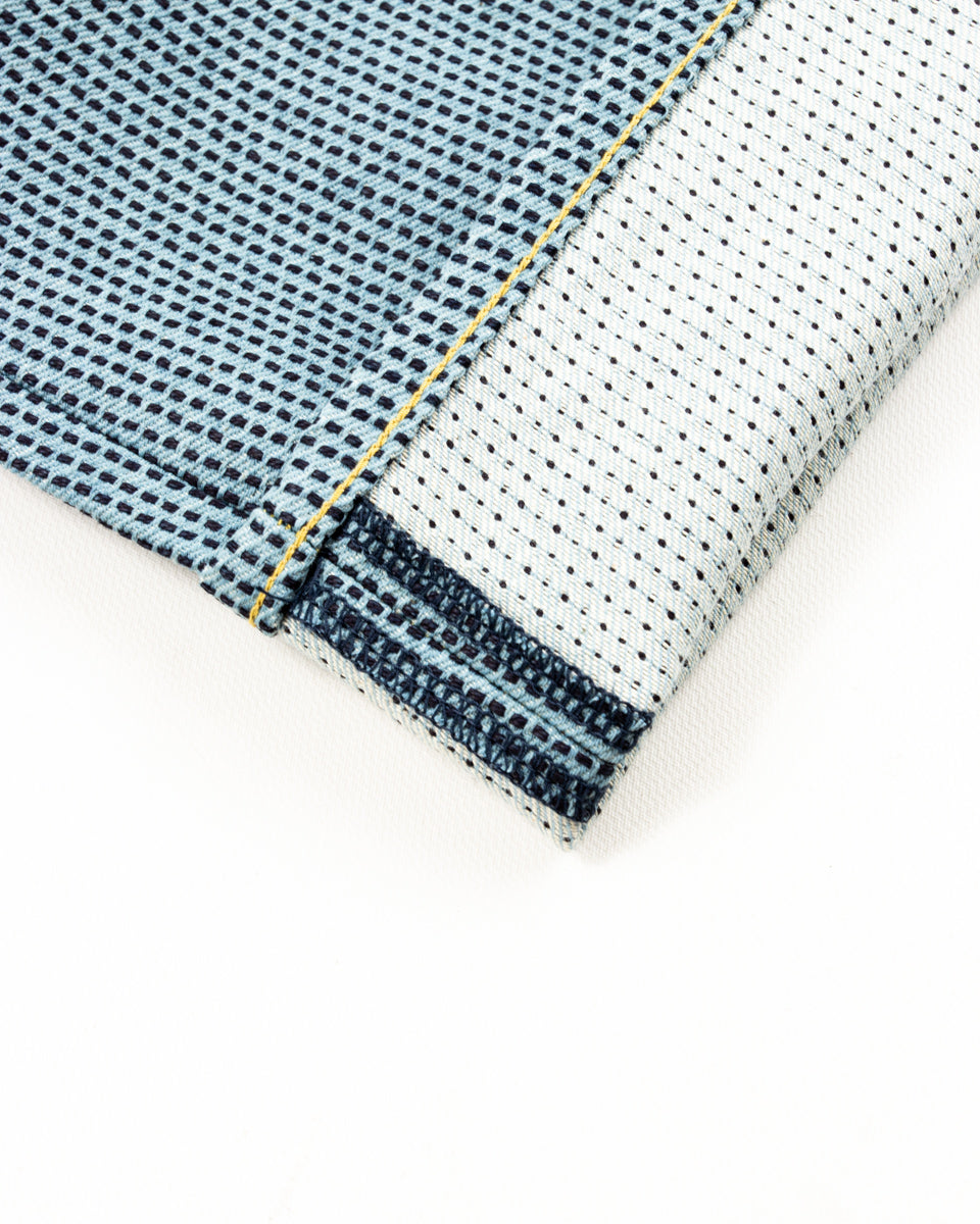 Sashiko – literally, ‘little stabs’ - is a form of stitching that was initially utilized functionally to repair or reinforce damaged fabric that eventually came to be used for decorative purposes. The sashiko on this fabric uses rope-dyed indigo to give a unique hand feel and appearance to the denim.