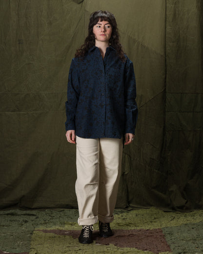 It's made from a handwoven denim dyed with natural indigo and iron based dyes for a deep black/blue fabric, further enhanced by the micro floral print throughout. It's solid and hard-wearing, a fabric that starts out stiff but will relaxed considerably over time, developing as a unique patina as it fades from wear.