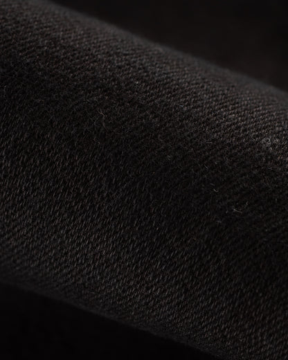 They're made from an 18oz 100% cotton Japanese denim that is finished with an all black overdye to imbue it with a rich dark color throughout. It's sturdy and thick without being too stiff or uncomfortable, having been treated for shrinkage and softness, and will only continue to soften over time from wear and washing.