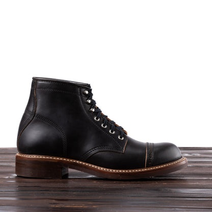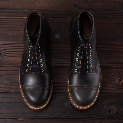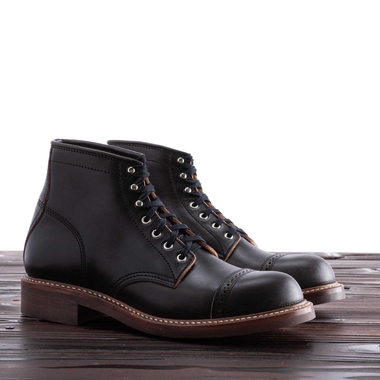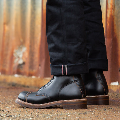 The Lofgren Combat boot is their take on the classic perforated cap-toe military boot, an iconically handsome boot that doesn't sacrifice sturdiness or durability. Standing at 6" tall, with a classic combination of 4 (polished nickel) eyelets and 3 matching speed hooks, they're built on the sleek Vibram 705 full sole (with matching Vibram 700 heel) - one of our favorite outsoles for its low profile and surprising blend of traction & durability.