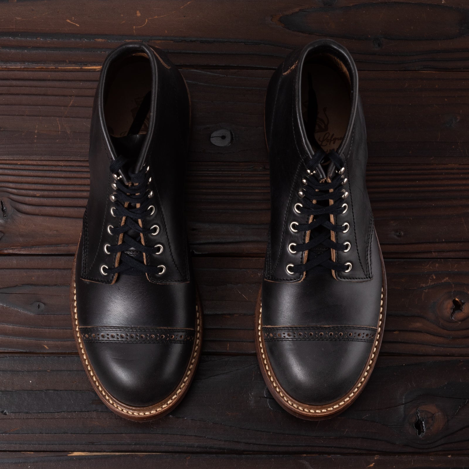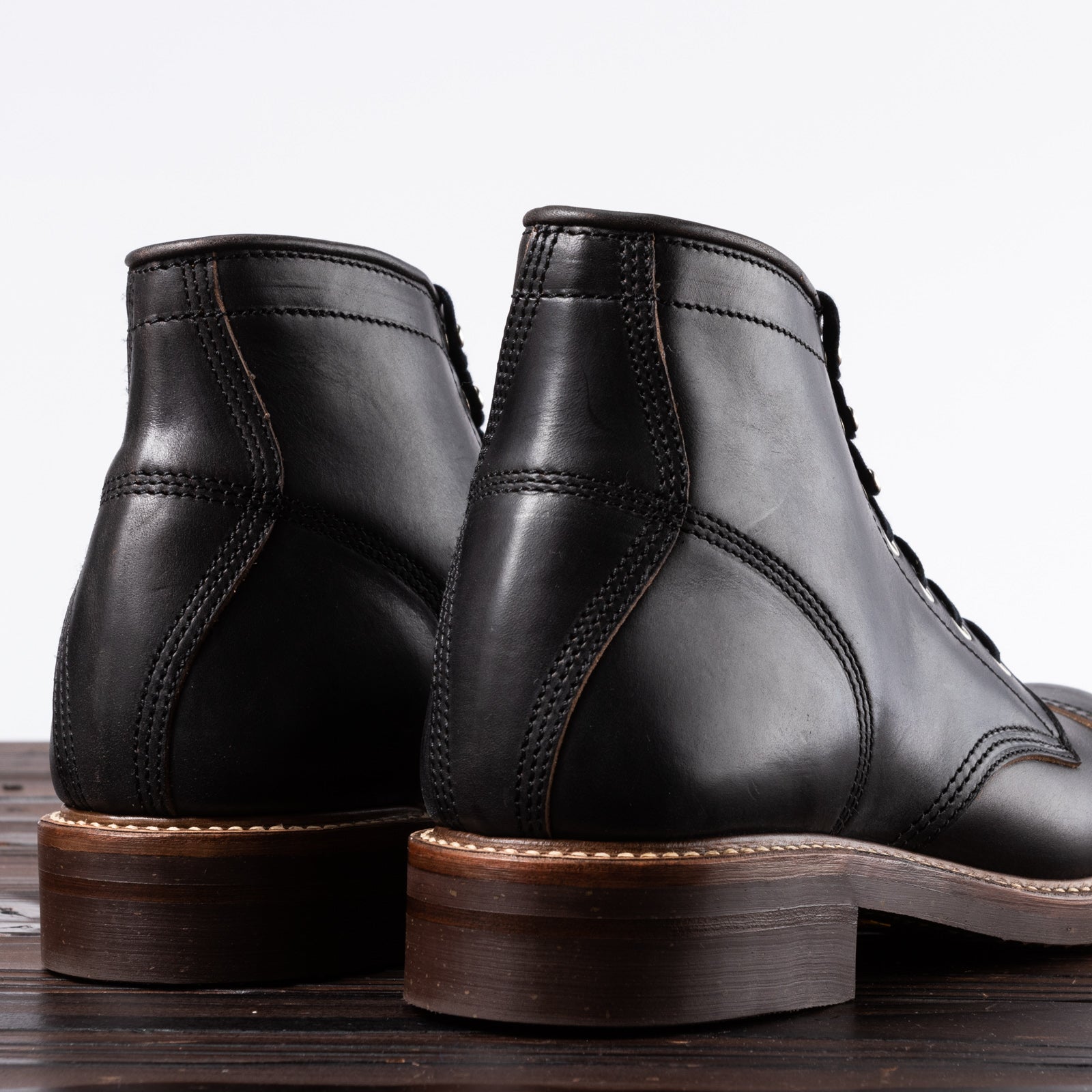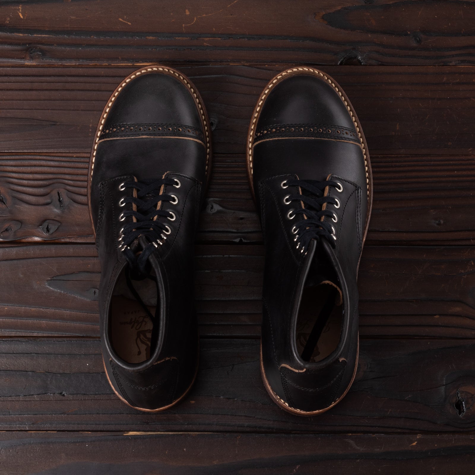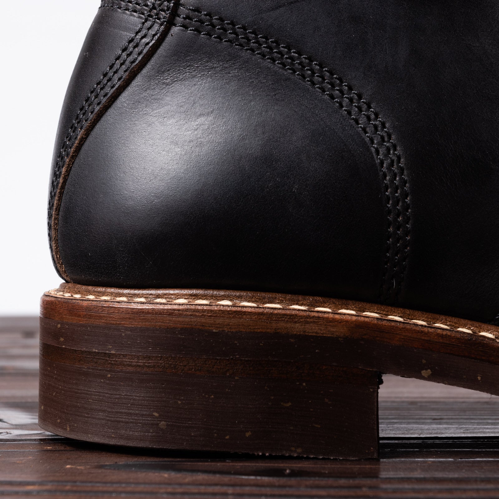 The uppers are made from Horween's Chromexcel cowhide, an extremely sturdy and handsome leather that only gets better and better with time. Horween Black CXL is a tea-core leather, meaning the dye hasn't fully penetrated the hide, sitting only at the surface above a "natural" brown core. Over time, that black dye will scuff off and wear down in certain areas, revealing a tan interior that will also darken and patina with wear.