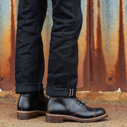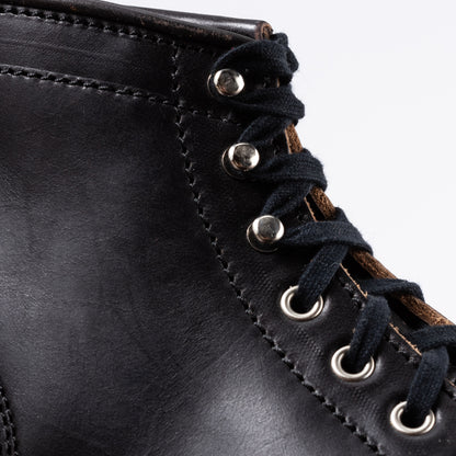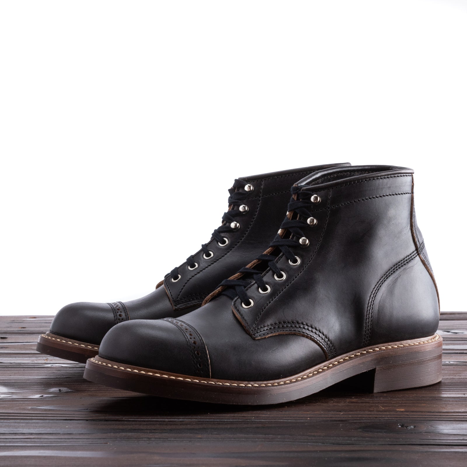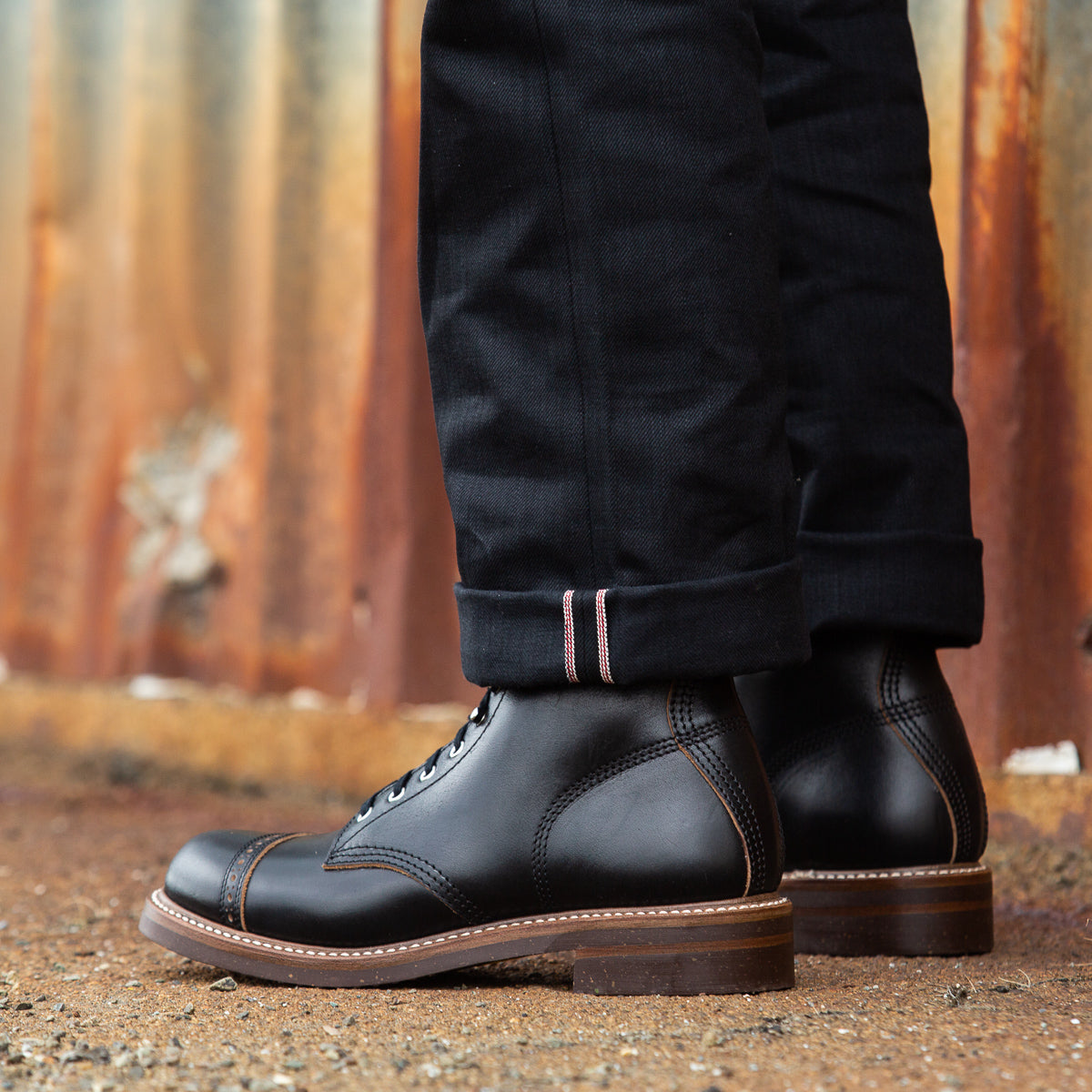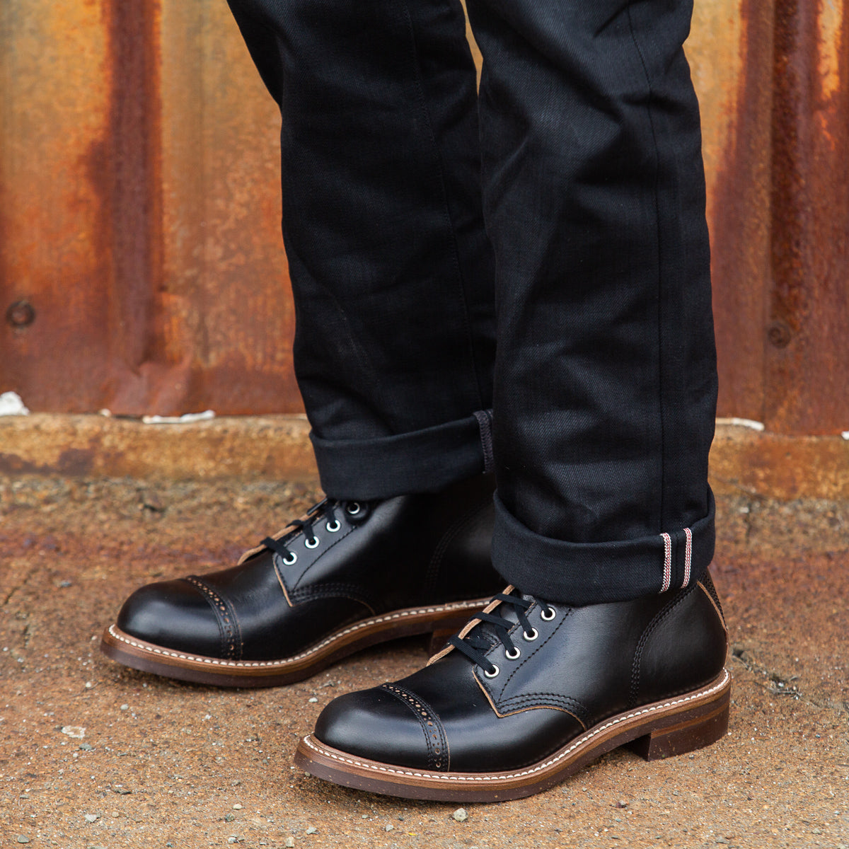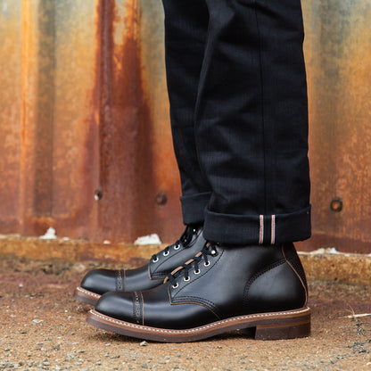 The uppers are made from Horween's Chromexcel cowhide, an extremely sturdy and handsome leather that only gets better and better with time. Horween Black CXL is a tea-core leather, meaning the dye hasn't fully penetrated the hide, sitting only at the surface above a "natural" brown core. Over time, that black dye will scuff off and wear down in certain areas, revealing a tan interior that will also darken and patina with wear.