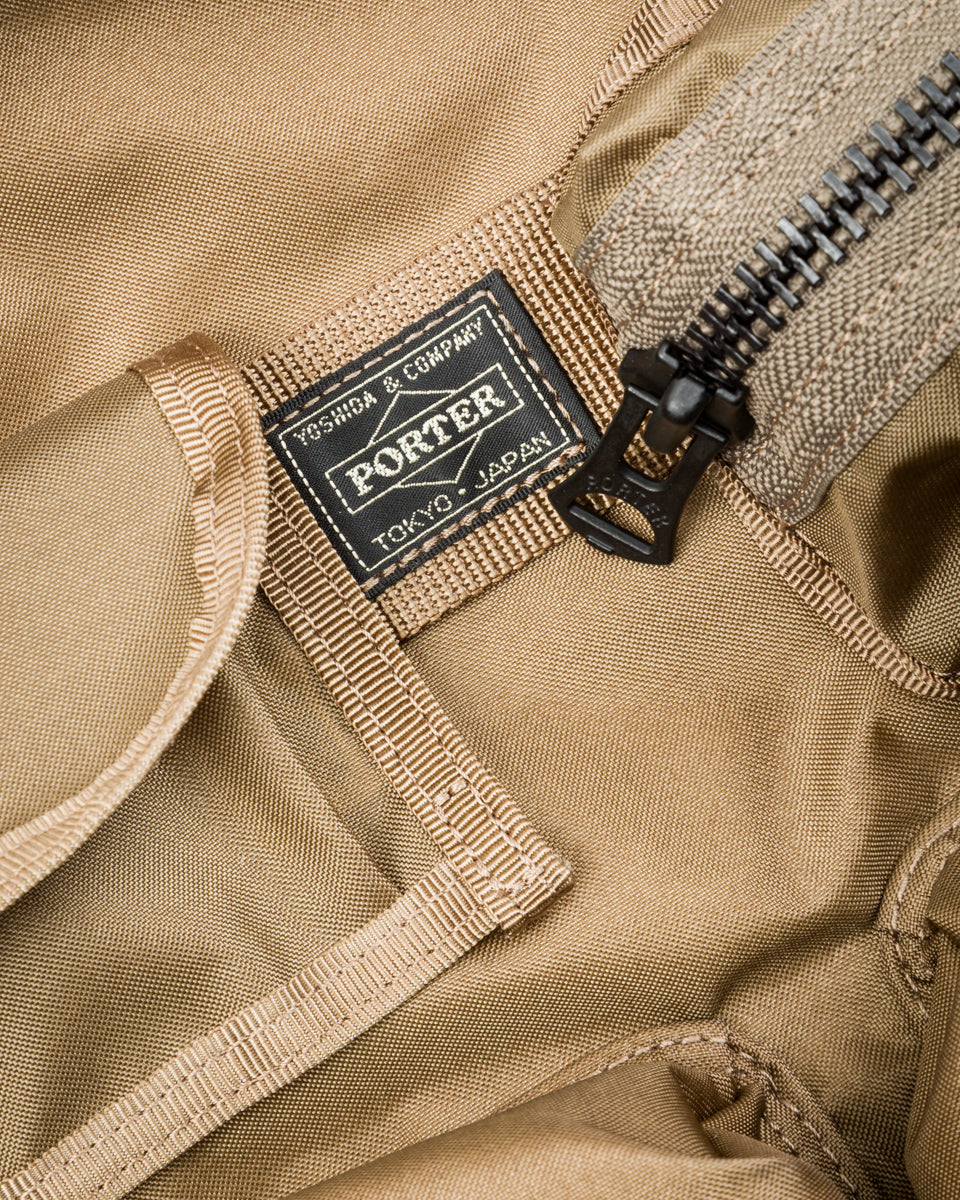 It's made from Porter's custom nylon 66 blend, an ultra high-density weave military style nylon with cotton bonding and nylon ripstop trims for extra durability. It's a soft and highly durable fabric, with a notable resistance to liquids and dirt.
