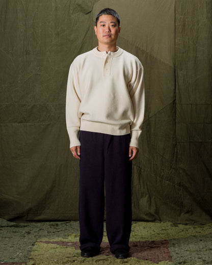 The Wool Henley Neck Longsleeve is a sturdy wool pullover with a relaxed body, crew collar, and a 3-button henley placket. Featuring a tightly knit face, the relaxed fit and full sleeves pair well with the plush wool yarns for a substantial and seasonally-appropriate layering piece.