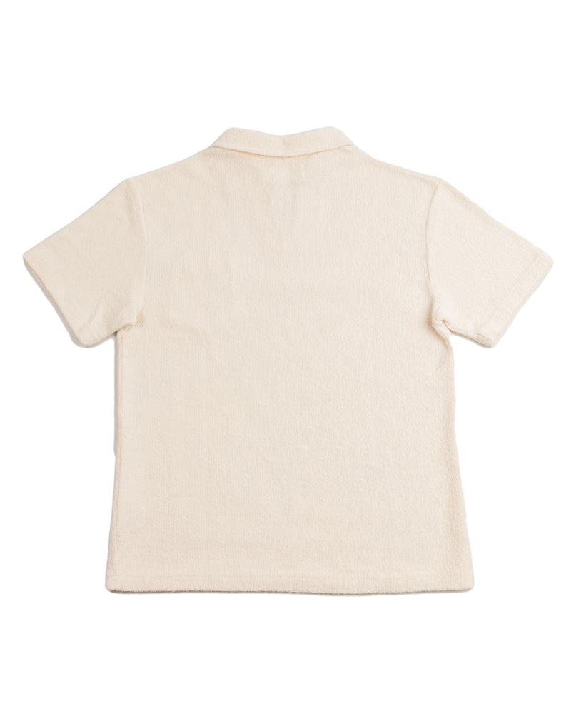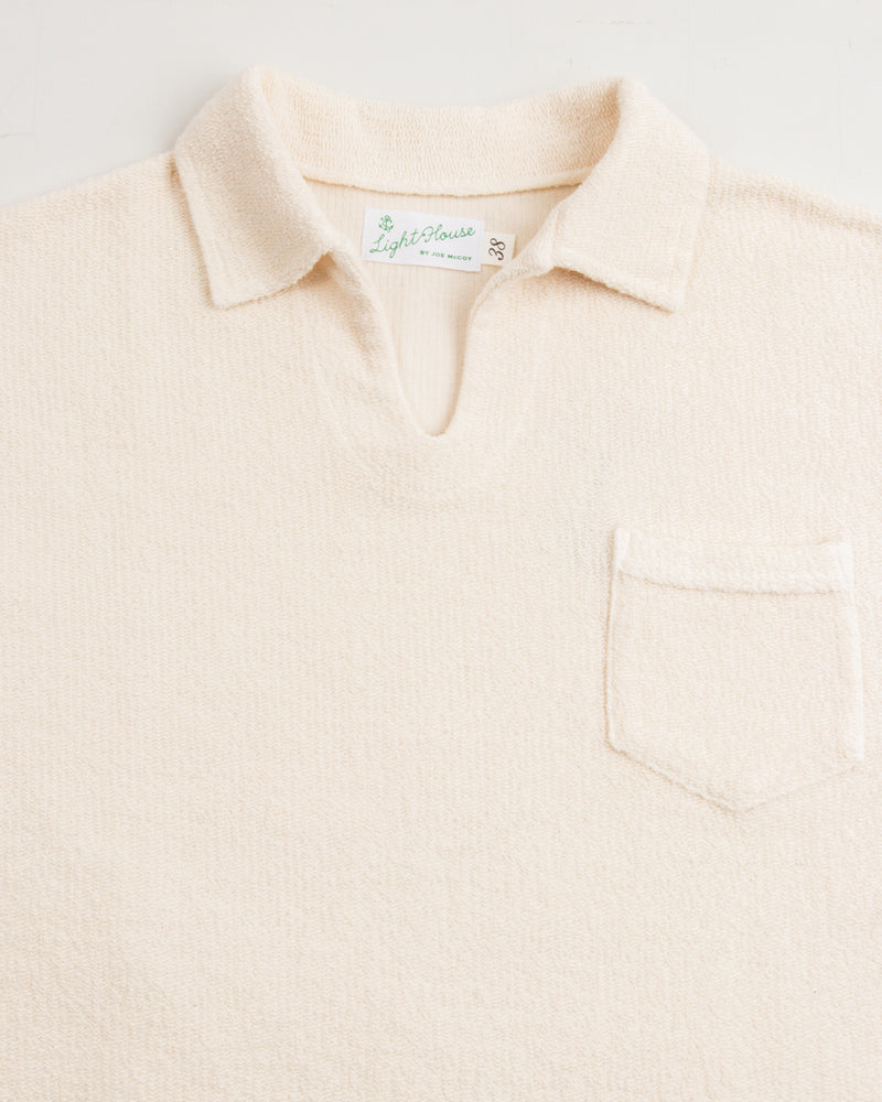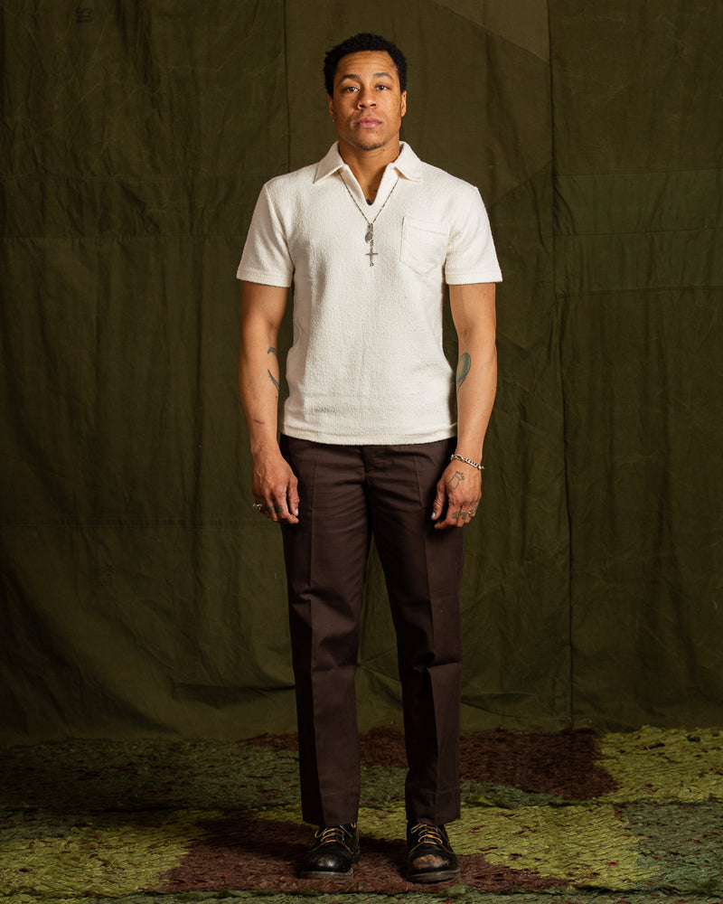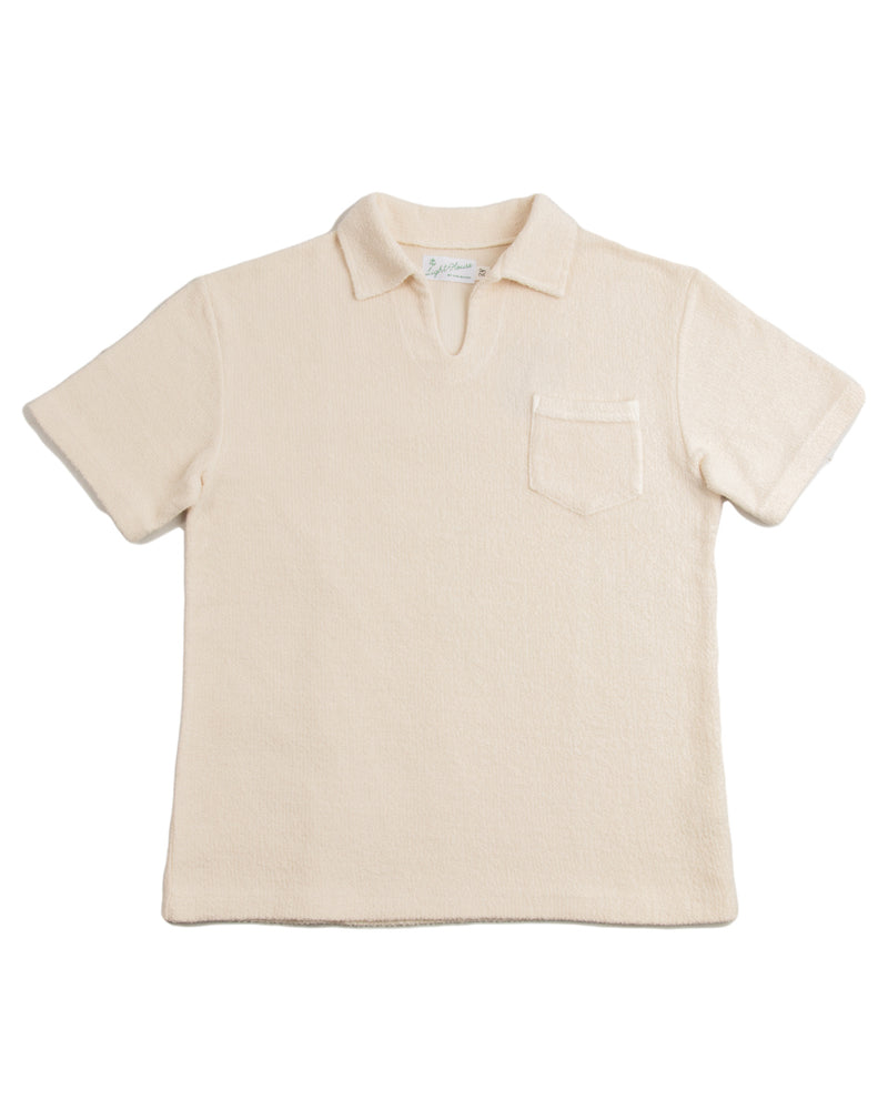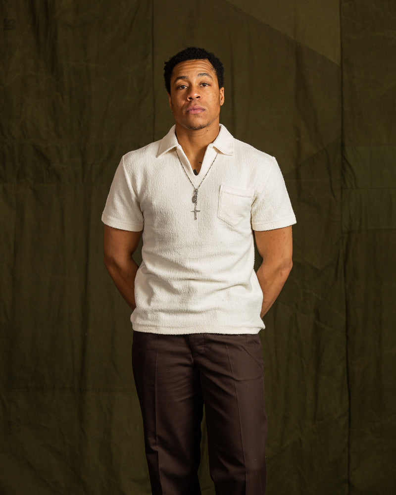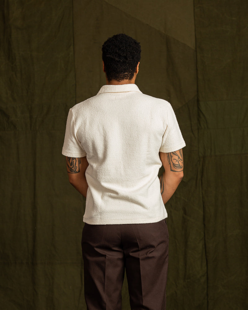 McCoy's Cotton Pile Skipper Shirt might be our favorite top of 2023. Inspired by resort and vacation shirts from the 1930s - 50s, it's an open front polo-style shirt using the latest from McCoy's lineup of stellar custom knit fabrics. Cut with a relaxed and slightly boxy fit through the body, the collar spreads easily and the front features a single open chest pocket.