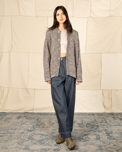 It's knit up from 100% cotton in a multicolor melange, using blended wrapped yarns for exceedingly complex tonal variety. The subtly colorful knit blends well with the low-tension of the garment itself, giving an extremely detailed impression whether up close or from afar.
