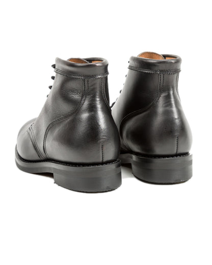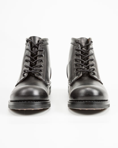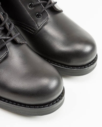 The other details are equally serious, with heavy rolled edge at the ankle (finished with miniature pinking) that cradles and protects the parts of your human body that interface with these boots. Beneath the double midsole, these stand on a foil stamped cork outsole, with a Belgian cowhide and Iron toe tap screwed & sewn in at the front. The heel is custom, developed in house by The Boots Factory themselves.