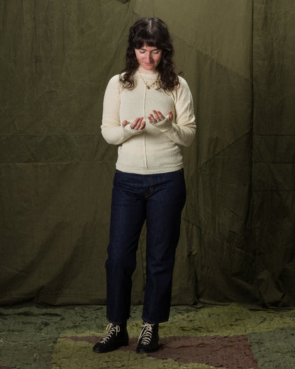 The Elle Thermal is a fitted thermal with tight ribbing, raglan sleeves, thumb holes in the cuffs and vertical seams down the front and back. It's made from baby alpaca yarns that are extremely soft and insulate very well, making this an outstanding base layer for those extra chilly days.