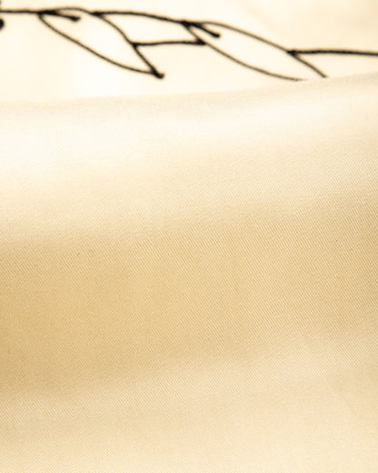 It's made with a heavyweight rayon twill with a full tencel lining. It has a satisfyingly-thick weave, with a heavy and fluid drape not unlike silk, and is extremely smooth and soft to the touch. The exterior features floral embroidery on the chest, collar, back, and sleeves, and the tencel lining slides easily over other fabrics and feels good on bare skin.