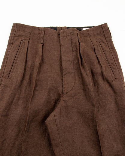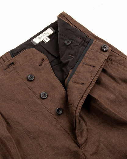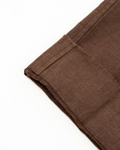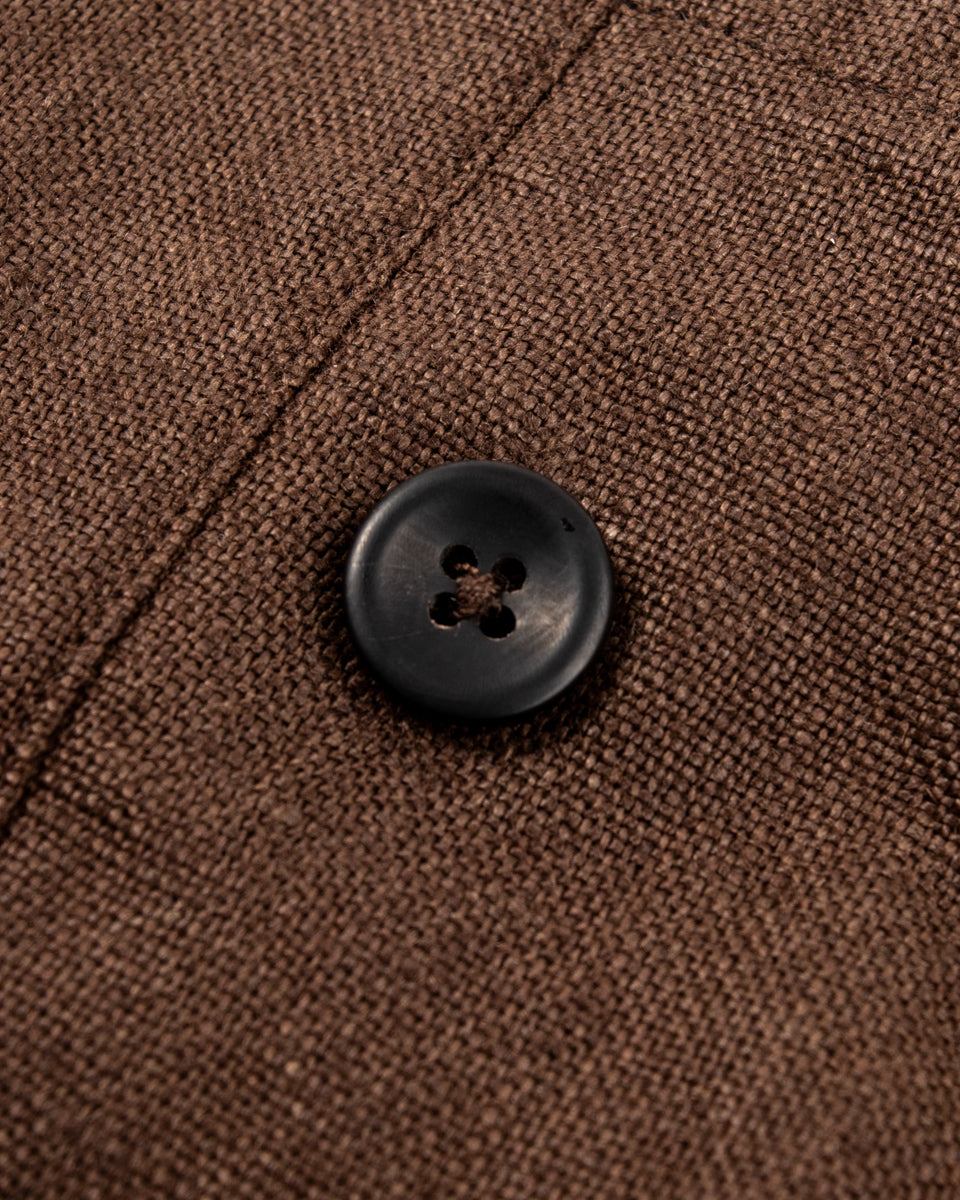 They're made from a rich brown linen, produced by Spence Bryson Mills in Ireland - one of the most renowned linen producers in the world today, with a history dating back to the 1800s. This particular fabric is a medium weight basket weave, giving the linen a little more structure and form than other twill weaves, but still allowing the material to breathe well and draping handsomely.