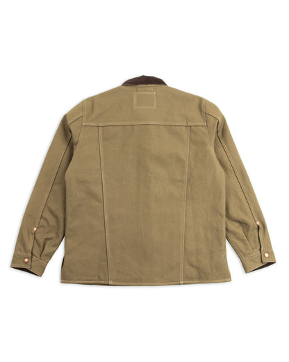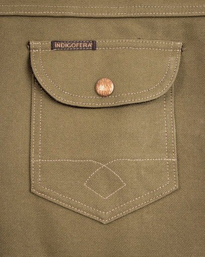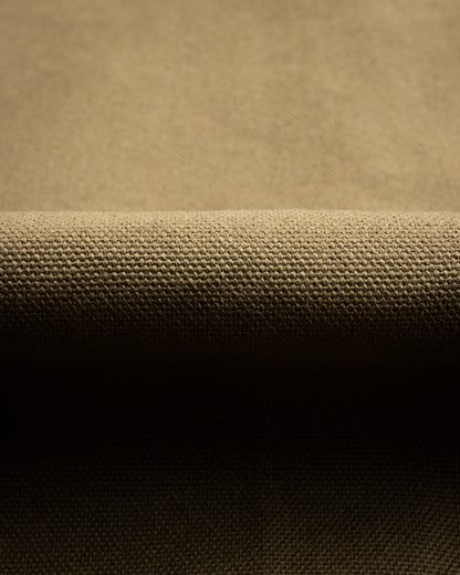 It's made from Smithson Canvas, a custom 13oz basket-woven cotton canvas developed and produced exclusively for Indigofera in Japan. This run is dyed a warm olive green, inspired by vintage military garments. Initially, the fabric is stiff, dry, and a bit crunchy - but over time it will break in and relax, becoming more comfortable, but no less hardy.