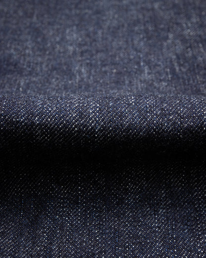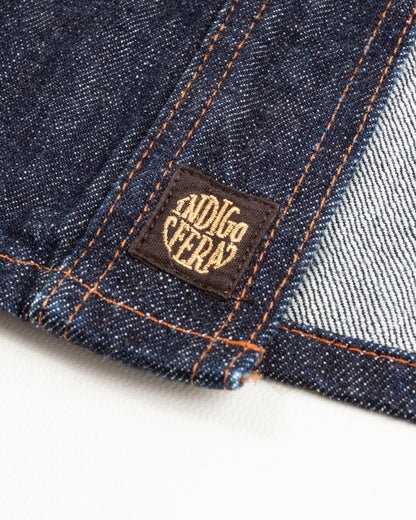 This 18oz selvedge denim is produced by Shiroyama Mills in Japan and with cotton grown in the USA. American cotton generally features a shorter staple length than Zimbabwean & Japanese cotton, giving it a more subtle slub texture and courser feel. For something a little different, the weft yarn (the white yarn) is heavier than the warp yarn. This, combined with the low tension weave, creates a rough, uneven appearance. Indigofera have additionally rinsed the whole thing to account for initial shrinkage and some of the break in.