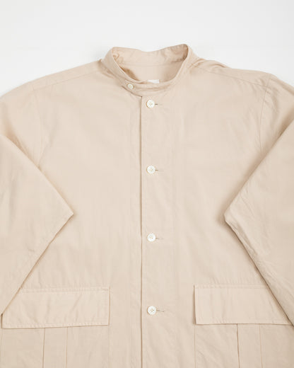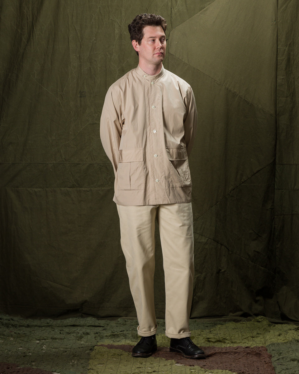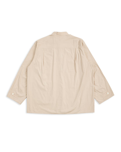 The Field Shirt is a band collar overshirt with an exaggerated fit and two roomy front pockets. The body is wide, with a tonal 5-button placket and a flat hem that give the garment a more casual silhouette. It's got dropped shoulders and big sleeves that make layering easy, and the two front flap pockets feature box pleats and bottom panels that allow them to expand significantly while in use, but still sit flat when empty.