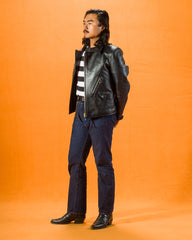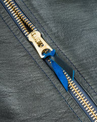 It's made from a custom Japanese horsehide that's been hand overdyed navy, and will fade to lighter tones of blue in high wear areas very quickly. Beginning as an undyed vegetable-tanned leather (one of our favorites), the hides were overdyed blue before the panels were cut and sewn into each jacket. Hand-dying results in greater variation with regards to overall color, as well as less "stability", meaning the pigments will wear away more quickly than other dyeing techniques (like drum dyeing, aniline finishing or paying an old man to yell at it).