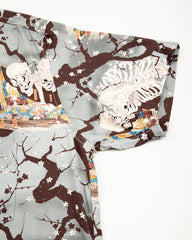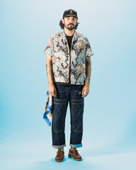 It's made from a lightweight 4oz printed rayon fabric from Japan, featuring a Japanese-style Skeleton design. Silky and breathable, it drapes exceptionally well and is perfect for hot weather. As usual, Freenote have made sure to meticulously pattern-match the fabric print across the front pocket.